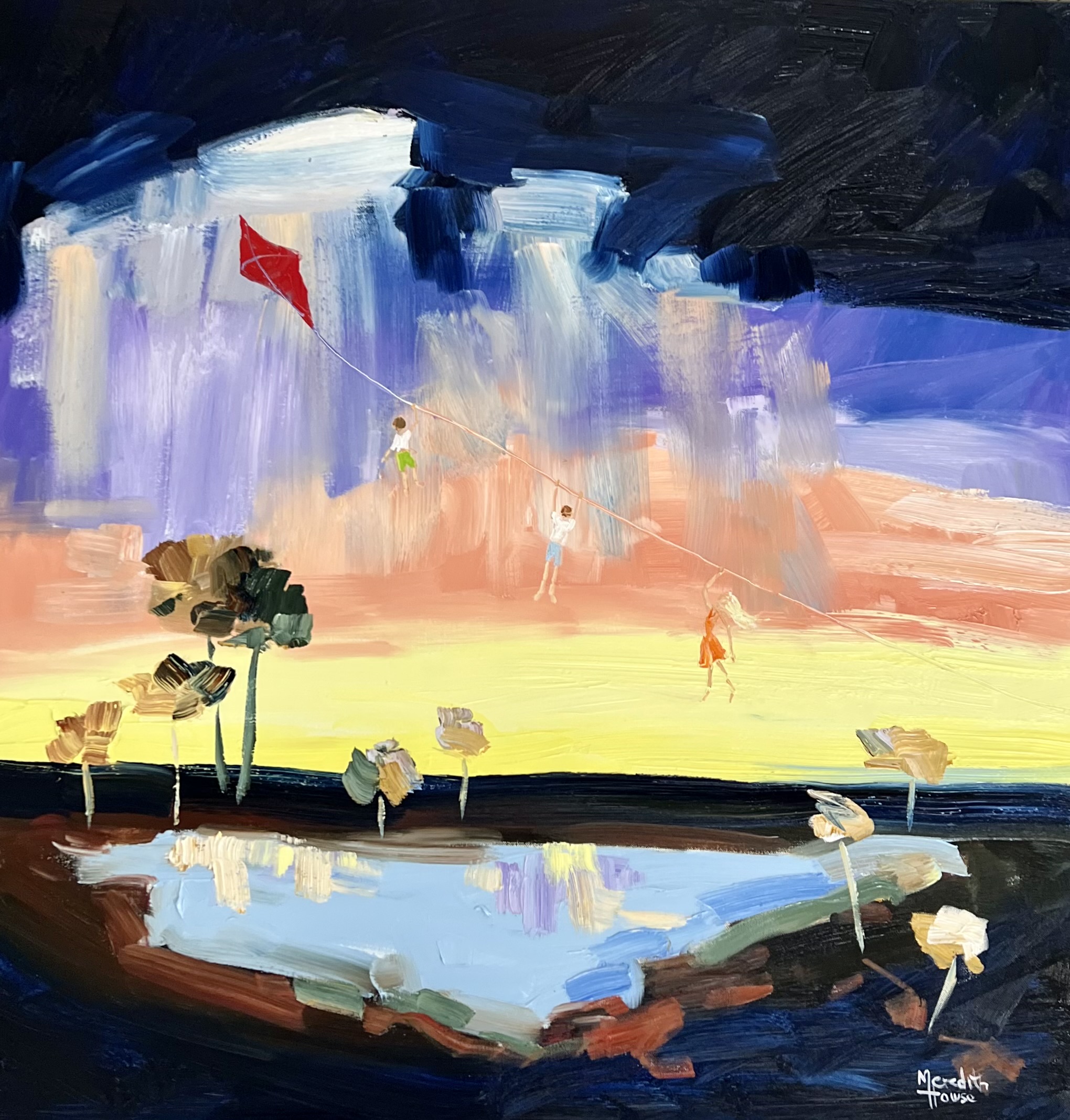 Outback Kite Flying by Meredith Howse is a colourful artwork that captures the essence of childhood and the joy of outdoor play. The painting depicts a three children, flying a kite over the Australian outback during the sunset. The painting is filled with rich reds, vibrant yellows, and deep blues, reflecting the breathtaking colours of the outback landscape.