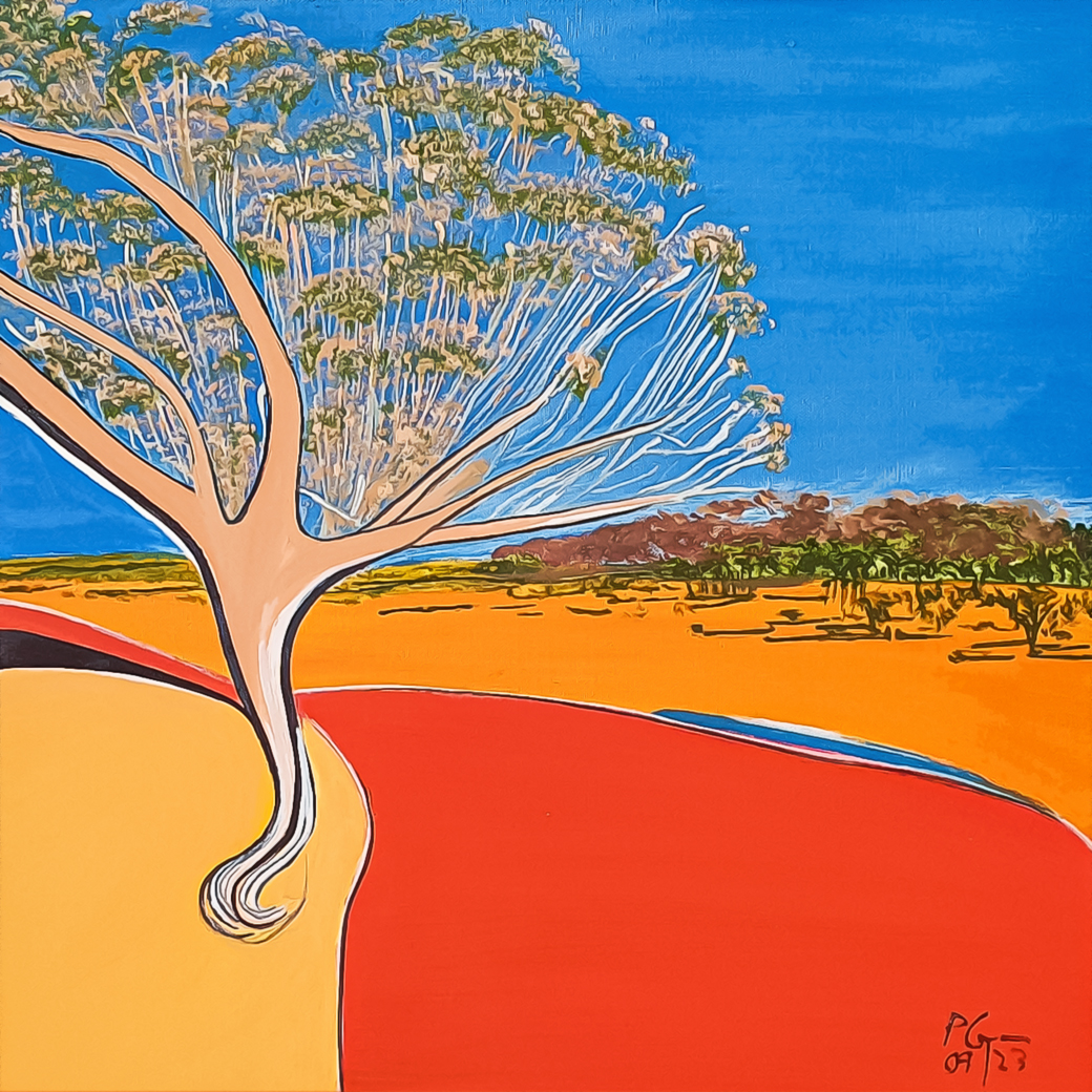 51 cm x 51 cm This image is a richly detailed painting set in a desert environment. At the centre of the scene is a bare tree with a multitude of branches, stark against the backdrop. This tree, seemingly void of leaves, gives a strong sense of solitude and resilience. This piece is an excellent representation of art that ventures into the abstract realm, with elements of a cartoon-style drawing contributing to its unique aesthetic appeal.