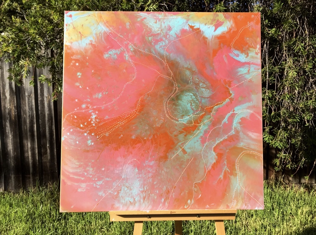 This is an original and unique abstract painting. The trails of the outback are many and varied. Some trails start from a farm or a tangle of trees and end at a watering hole. Some trails have no beginnings or endings. Some trails are informal walking paths that take you a short distance while others are major highways that seem to go on forever. The colour scheme of blazing orange, raspberry red/pink, gold, cream, light blue, purple reflect the wild Australian landscape.