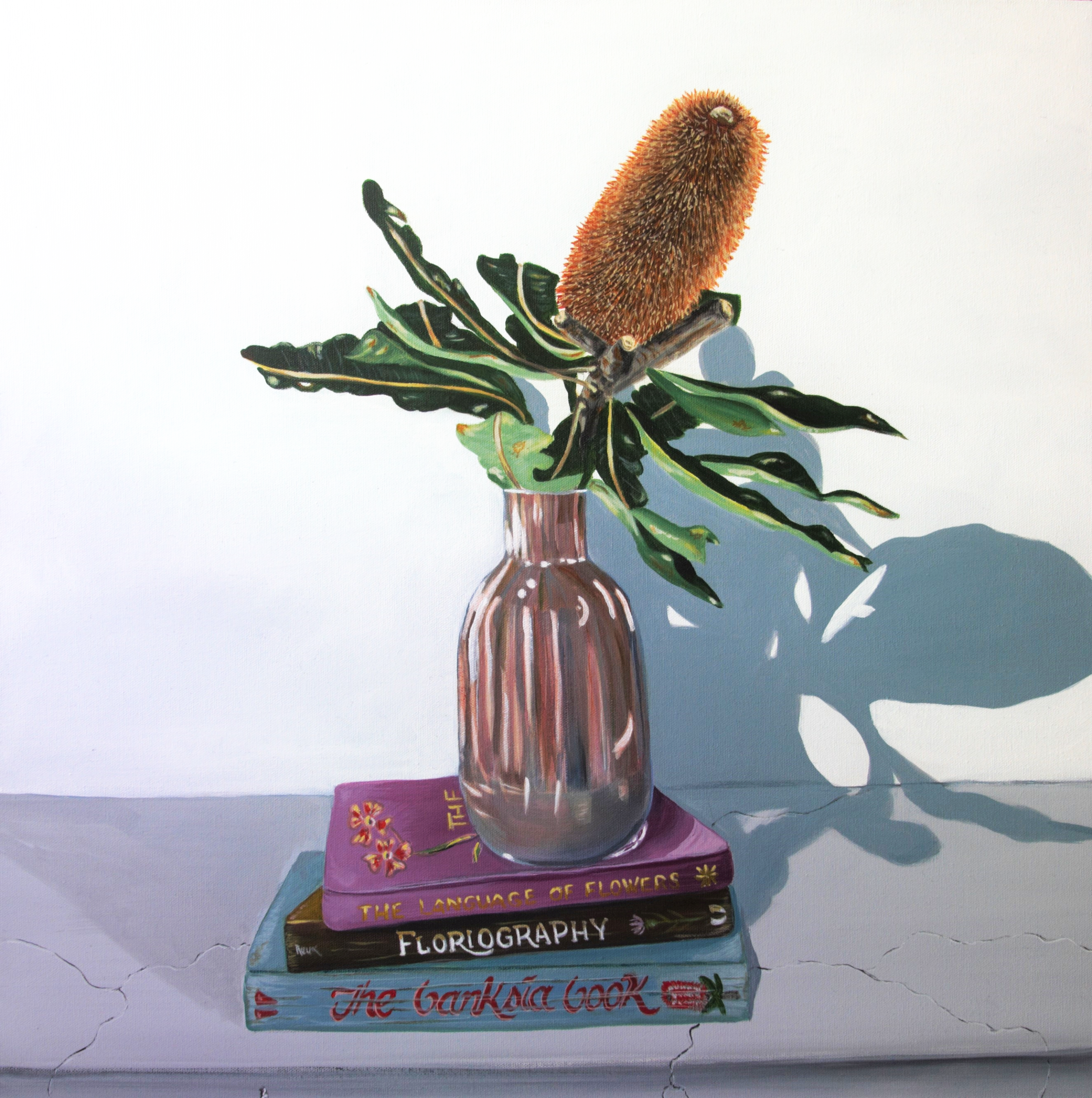 ‘Outside in’ is a robur banksia flower broken from my tree in recent storms. It now lives in my studio showing all the beauty of banksias through its different life stages. The banksia is in a pearlesque vase atop some of my favourite books.