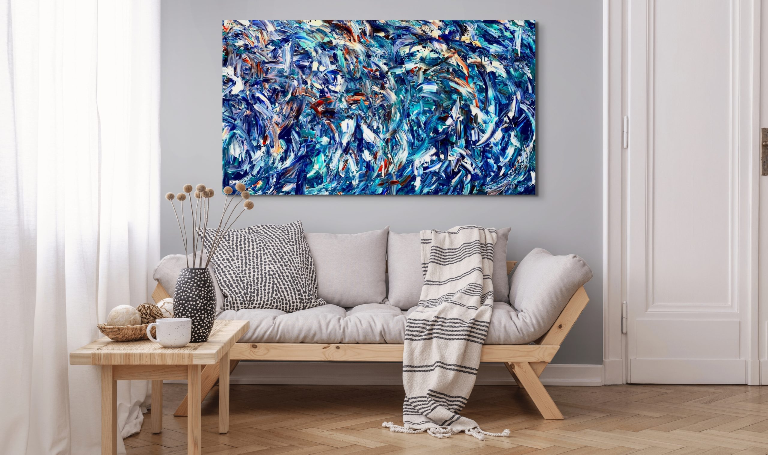 This artwork is painted on professional-grade canvas stretched and sealed with varnish. The canvas has dimensions 170 cm in width by 95 cm in height. The painting is painted in the same manner as the surface on the sides, giving a colour wrap.