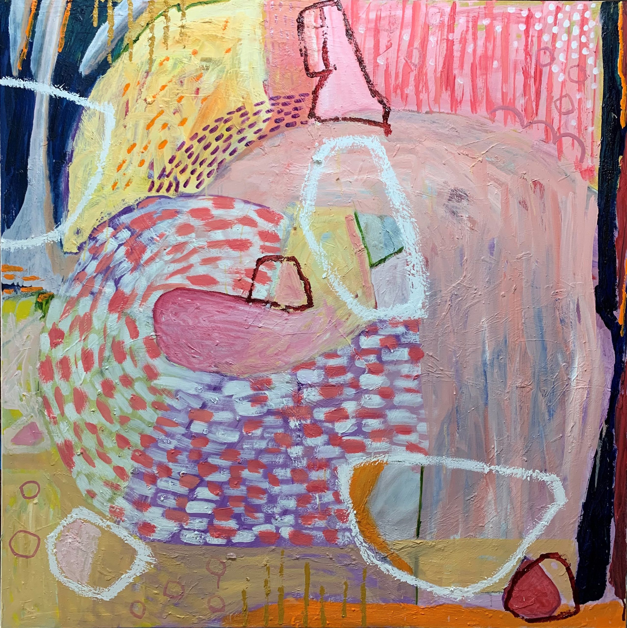 Overflowing Touch of Persistent Harmony is an ode of my long lasting love to my partner. It is a big, bold piece with large strong brush strokes with colours carefully chosen. The colour palette is primarily soft yellow & light pink, which firstly represents the colours of the roses that are in our garden. Secondly, yellow offers the feeling of happiness, joy and positivity, while pink relates to love, nurturing and passion.