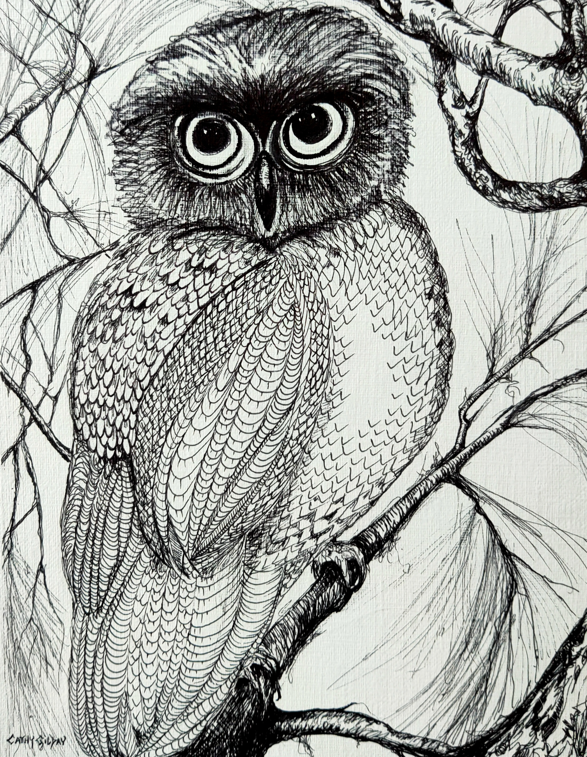Owl in Pen by Cathy Gilday – Owls are fun to draw or paint because they have notably large eyes, which automatically gives you that aw factor. Somehow, they can look eerie, mysterious and wise, yet still manage to have a whimsical feel about them. I drew this piece in pen on textured canvas paper. Signed front and back and requires framing. Signed front and back.
