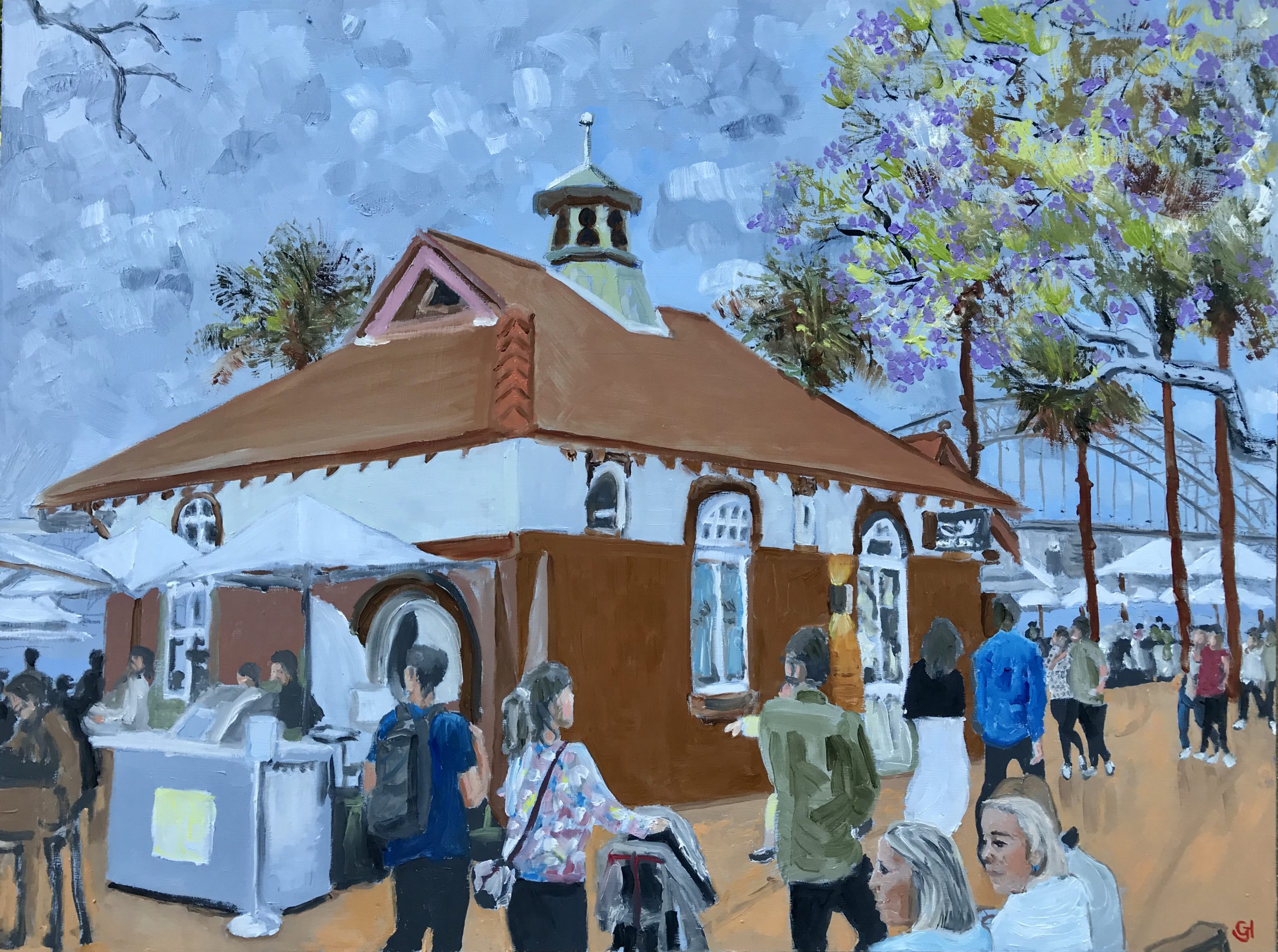 Oyster Bar, Circular Quay by Geoff Hargraves – This little building sits out alone on then promenade around Circular Quay. Speaking of a bygone era, its is now dwarfed by the wall modern tall buildings bordering the side of the promenade. A lone Jacaranda tree with its flash of purple sits amongst the palms. Oils on cradled wood panel, H59.5 xW79.5cm x2 cm