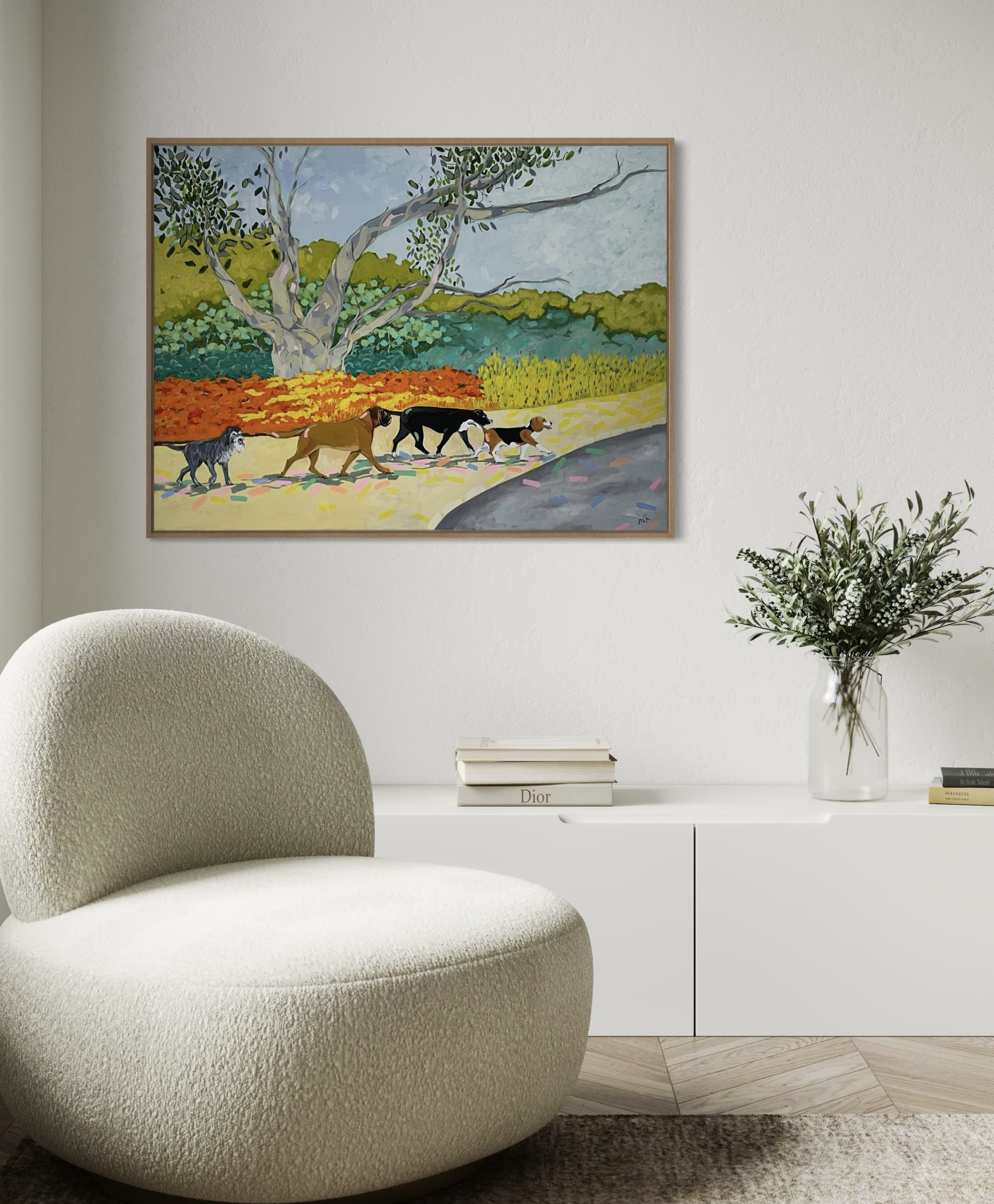 Four dogs out for a stroll….so much fun! This brightly coloured acrylic painting is joyful and celebrates the absolute cheer that dogs bring into our lives. Coming in a recycled floating frame it has a back wire and is ready to hang and enjoy.