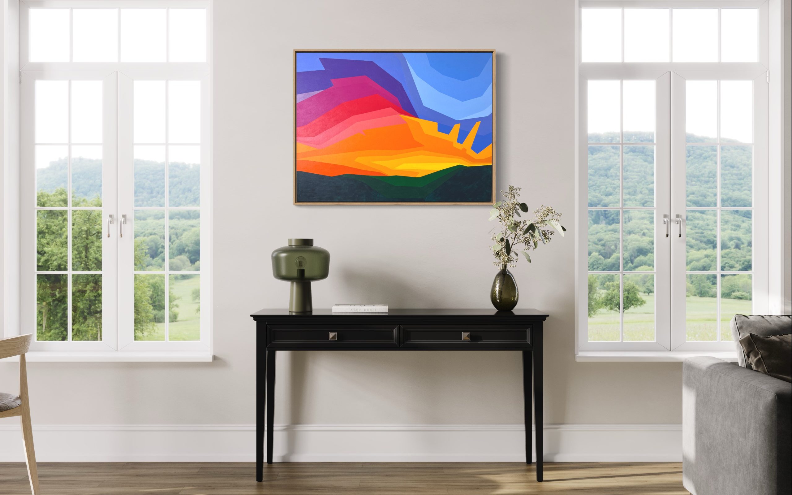 Australia’s incredible sunrise across South East Queensland from the Pages Pinnacle summit in 2023. The vibrant sky depicting the glows of yellow through to purples over a shadowed bushland. Movement and form is depicted by directional fragmentation. Suggestions of shadow and construct of our incredible landscape. A glowing sunrise over South East Queensland from the Pages Pinnacle summit. A Fractured landscape of hard edged geometrical solid colours depicting a vibrant sunrise. Colours from intense yellow through to deep purples over a dark shadowed bush land.