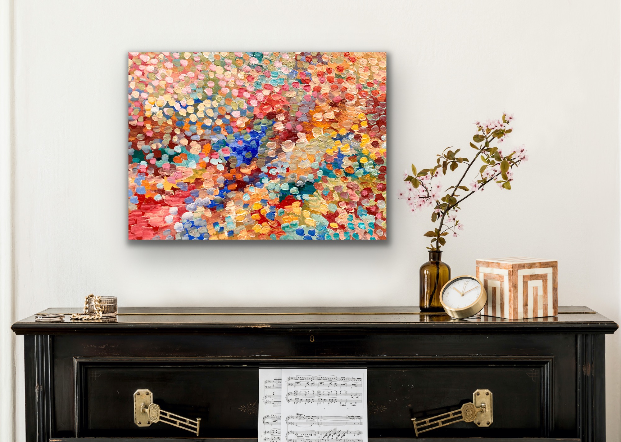 Palette of the Forest by Theo Papathomas – A painting with a pallet of rich colours like a veil of petals covering the hills. The landscape becomes a bouquet of petals dancing over the land. I tried to create this beautiful composition of colours of the landscape and softly becoming one with the sky, waterfalls and hills. Capturing the beautiful colours of the petals, foliage of the trees like musical notes dancing over the landscape. A very harmonious and tranquil composition that can be enjoyed many years to come. The painting is signed and dated 2021 at the back and comes with a certificate of Authenticity.