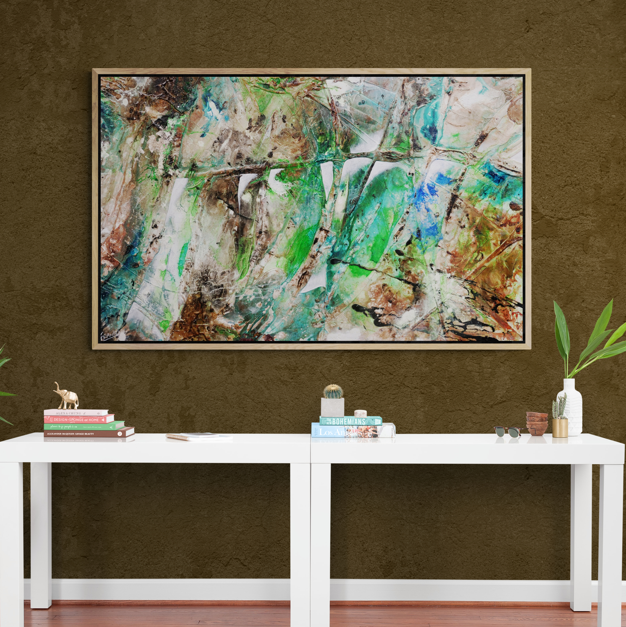 Provided with listings are some insitu images. We strive to ensure they are accurate in scale. Sometimes we will add an external frame to the painting insitu, to provide a vibe for how that would look also. As mentioned above, my pieces arrive ready to install with gallery finished edges and honestly, most people don’t add external framing. However, it is of course an option. If you have any questions, please let me know. We are here to help and want to make it as easy as possible for you if your décor aspirations require it.