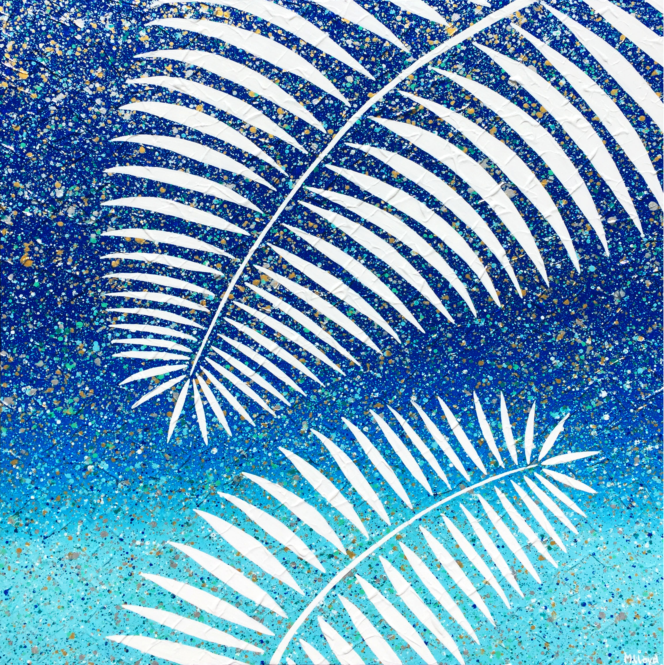 Palm Tree Leaves by Miranda Lloyd – An abstract take of palm leaves with a coastal vibes. Electric deep blues to a gradient of a lighter blue. A calming piece with a holiday vibe. Heavy textured background. Bring the outside inside. Painted around edges.