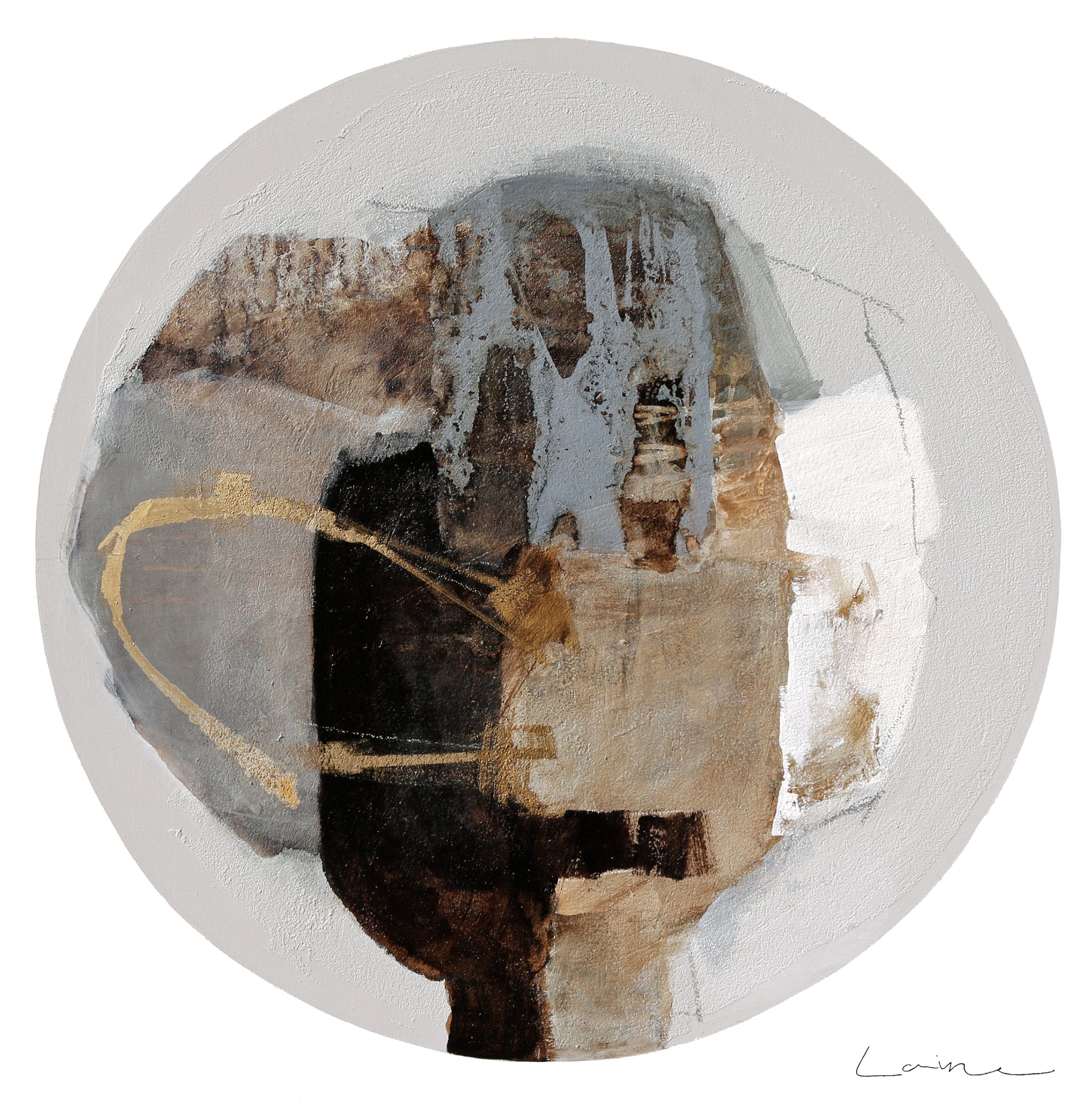 Pana is a beautifully textured painting and is a combination of greys and browns with touches of gold paint which is reflective in the light. This painting is sold on a stretched canvas so it’s ready to hang. The image shows a framing suggestion.