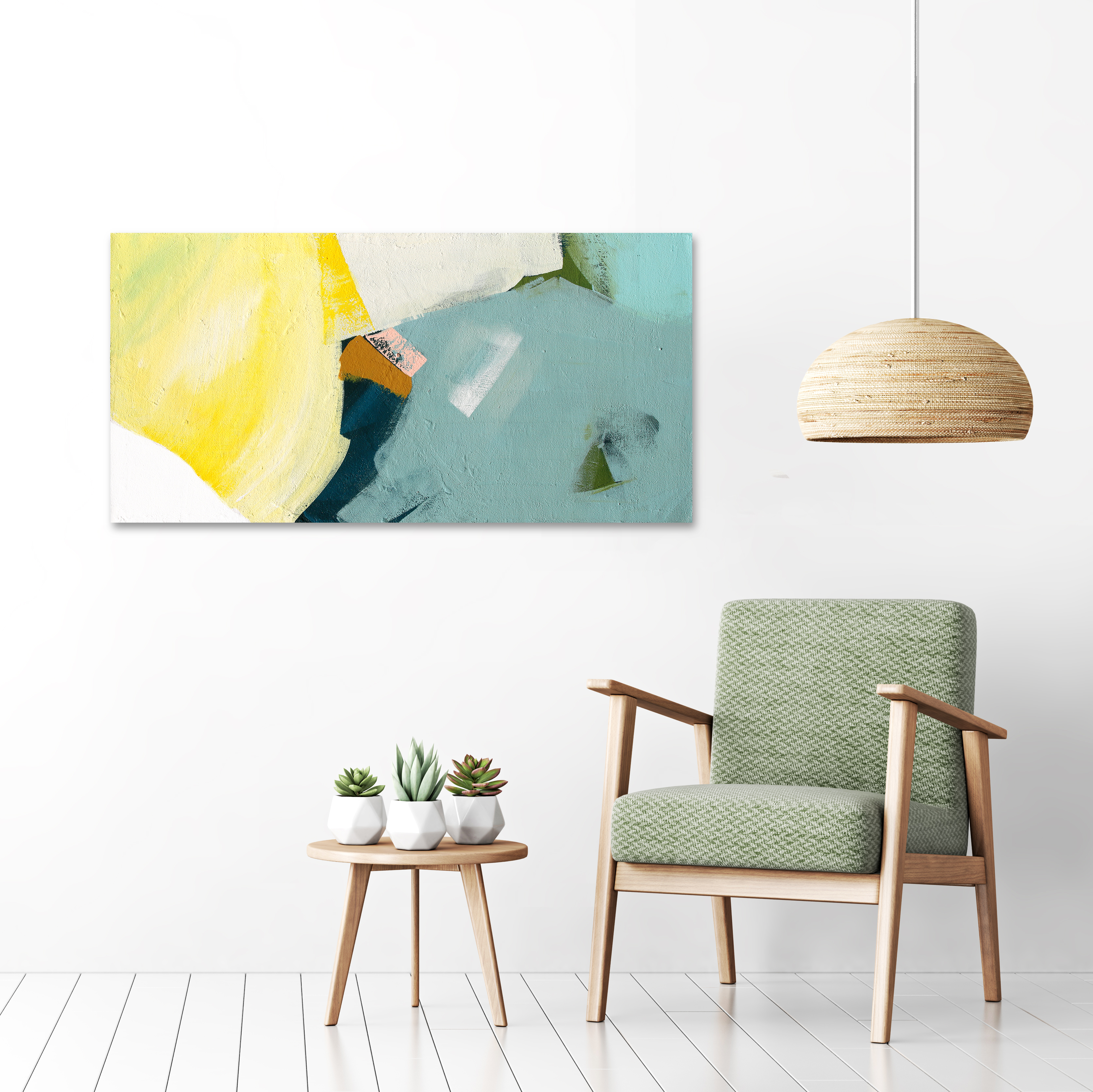 Pana is very textured and is a combination of yellow, grey blue and green with a touch of apricot and tan. The painting extends around the 3.8cm sides of the canvas so it’s ready to hang.