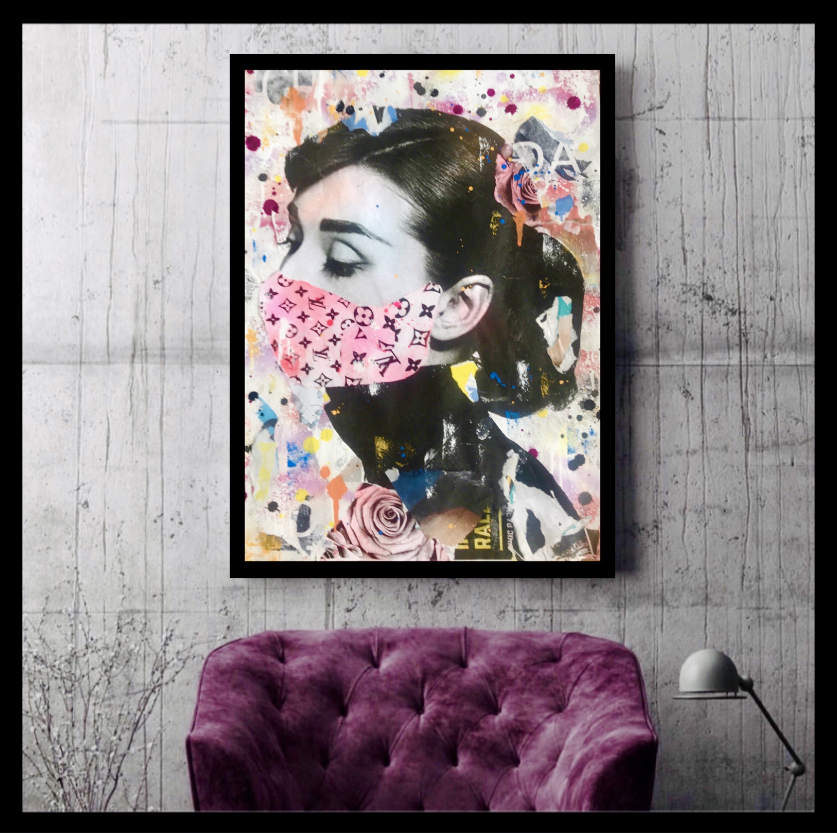 The main vintage image of Audrey Hepburn  was added and overlaid further with paint and paper to give a worn rustic appearance. The work was then given the most essential fashion accessory in the modern world – a face mask.