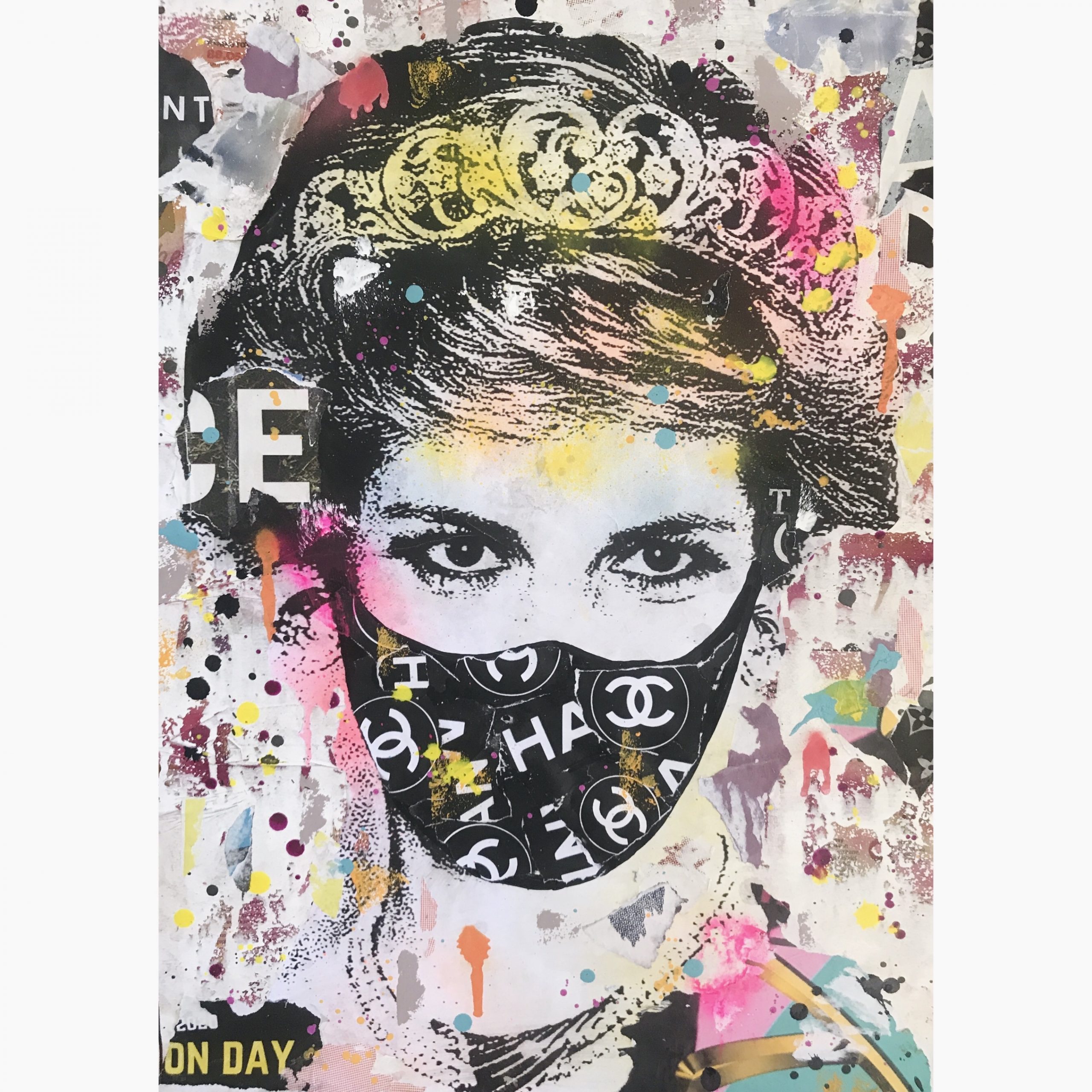 The main vintage image of Lady Di  was added and overlaid further with paint and paper to give a worn rustic appearance. The work was then given the most essential fashion accessory in the modern world – a face mask.