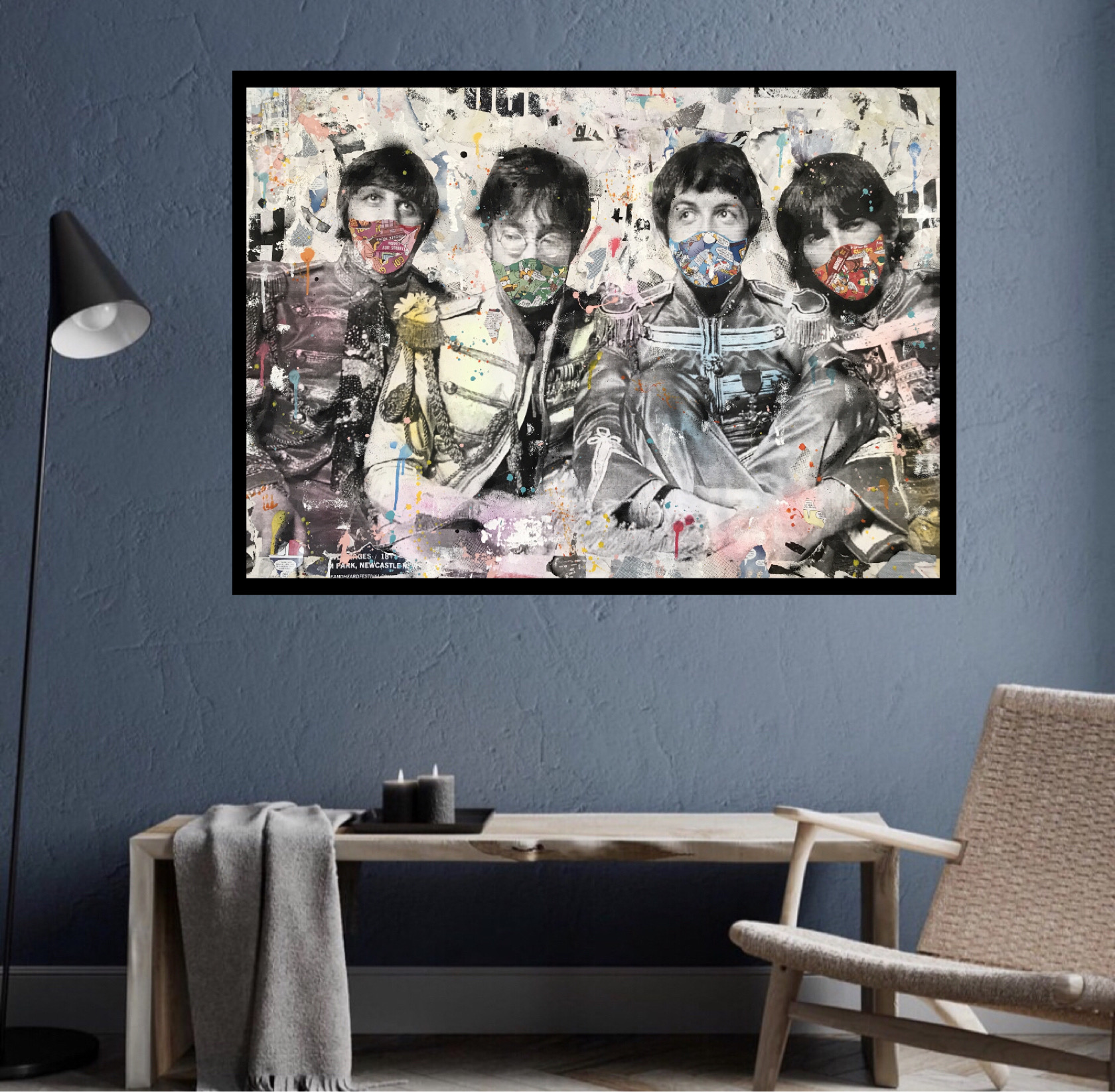 The main vintage image of The Beatles was added and overlaid further with paper and paint, then the boys were given the most essential fashion accessory in the modern world, a face Mask.