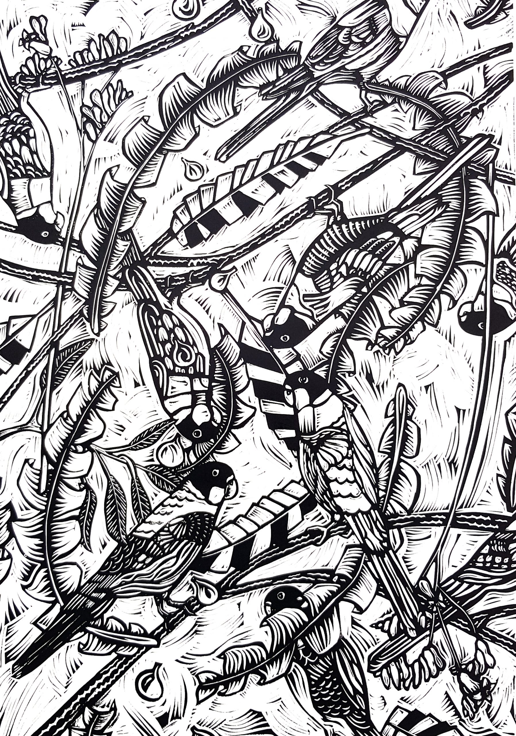 Pandemonium is an original handpulled linocut in a variable limited edition of 6.