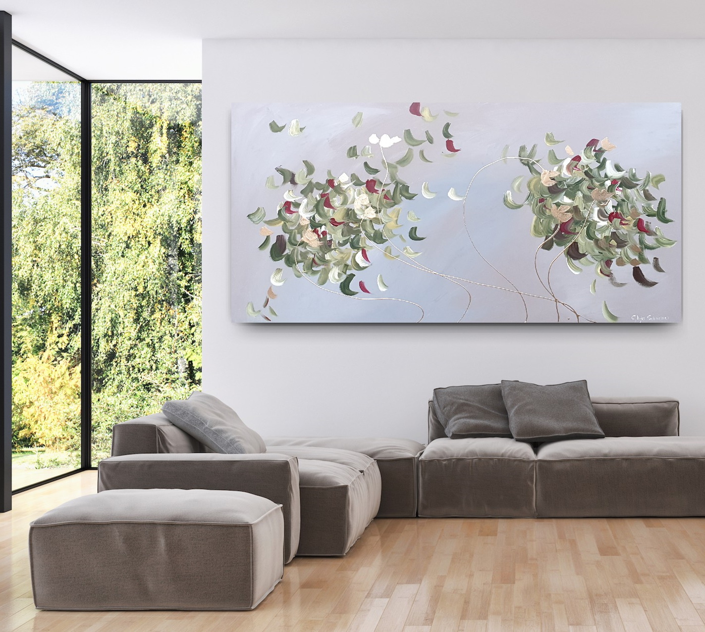 The painting does’t come with the external frame. The images attached are representations of what it could look like after being framed. No hanging wire.