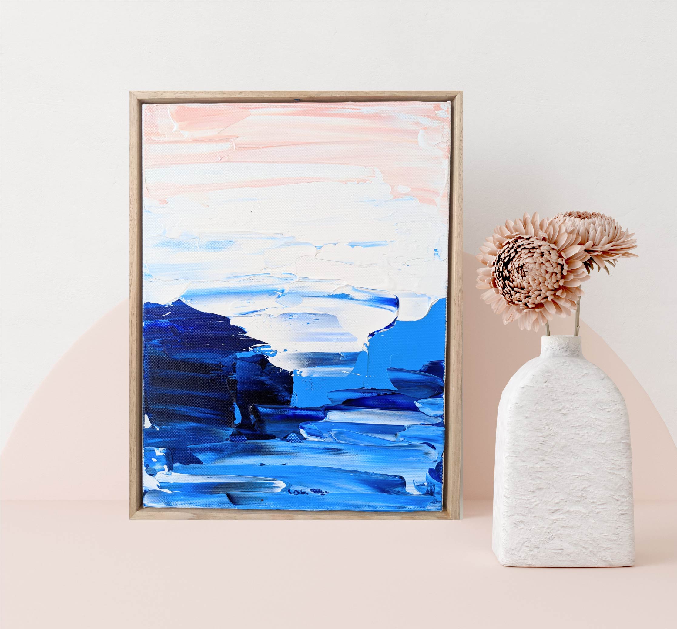 This artwork was inspired by my love affair with the ocean and it’s ever changing colour palette of blues with the pink of a sunset at the end of a beautiful day…