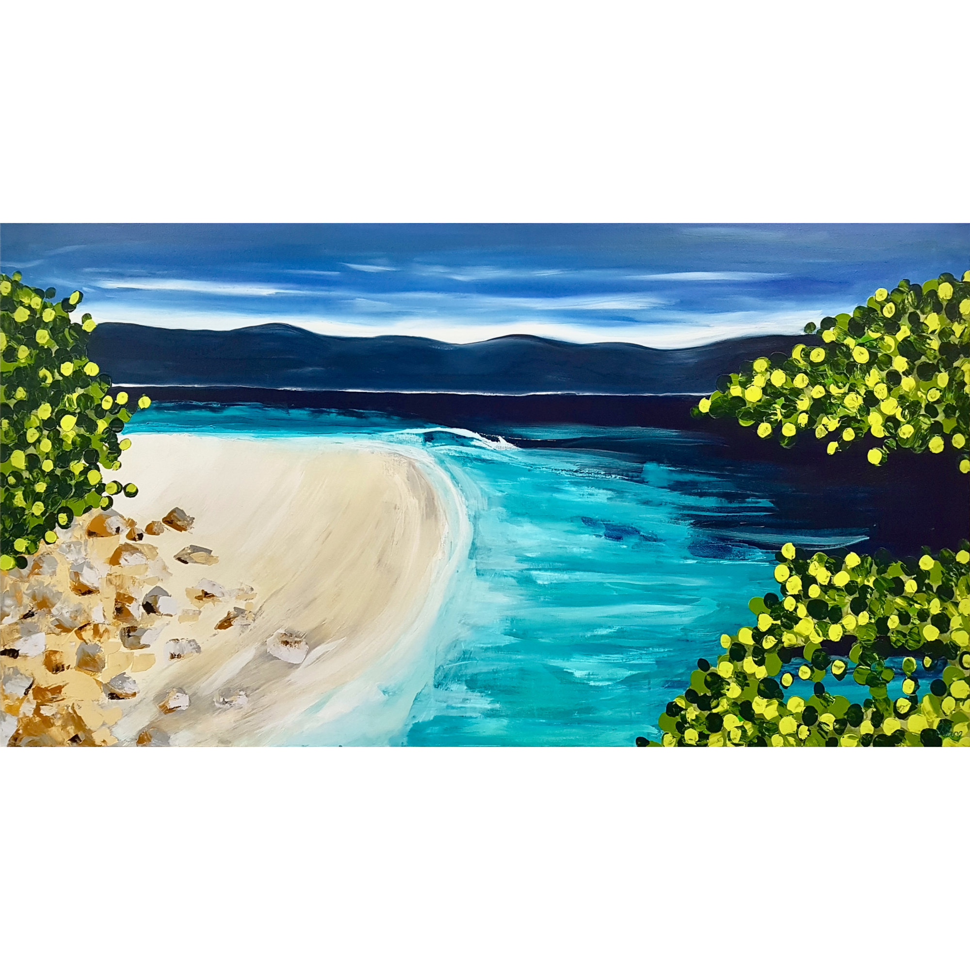 Hand painted on stretched canvas impasto style with a beautiful vibrant blue and green palette which pops against the soft sandy shore inspired by Nudey Beach, Fitzroy Island, Far North Tropical Queensland.