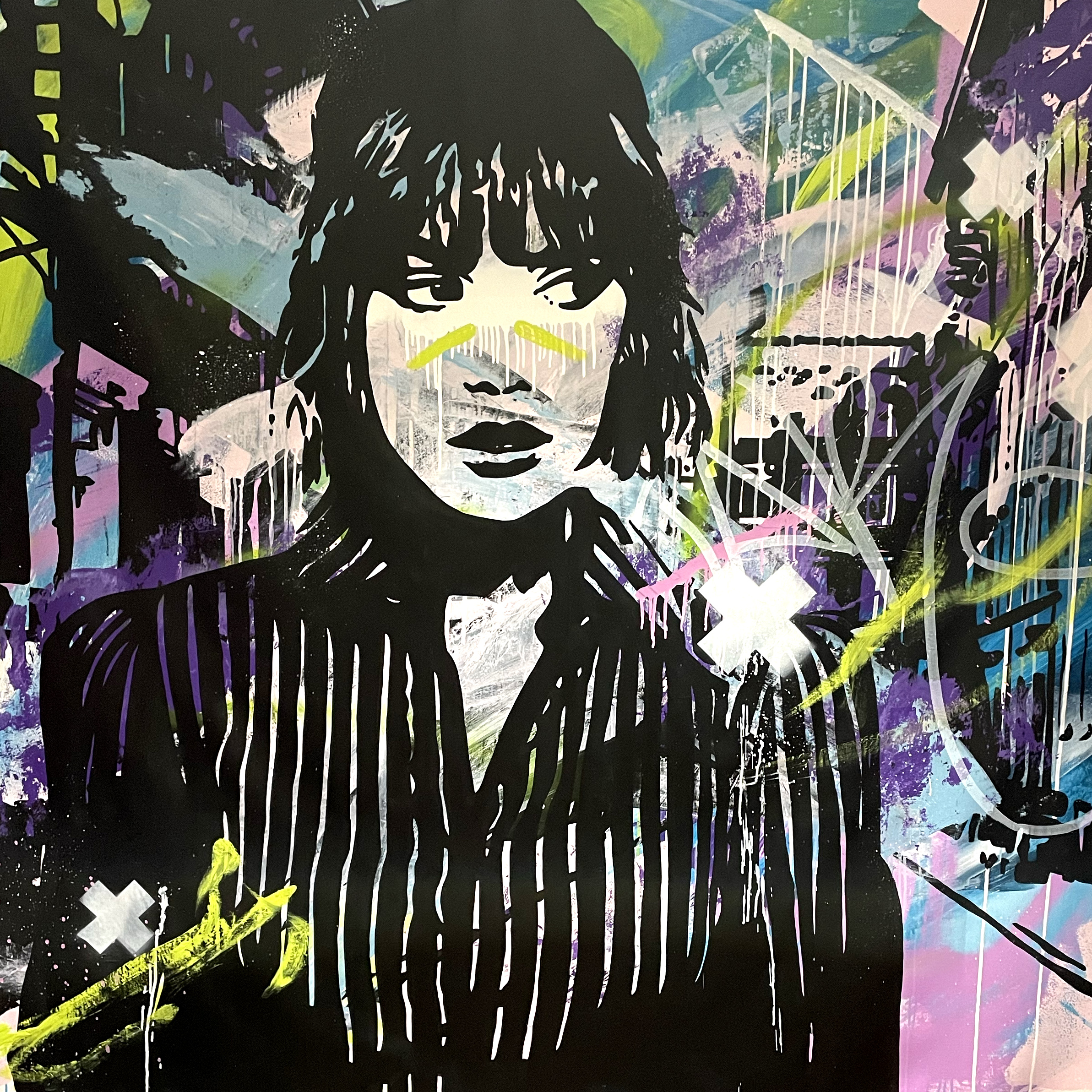 Acrylic, spray paint and ink on canvas.