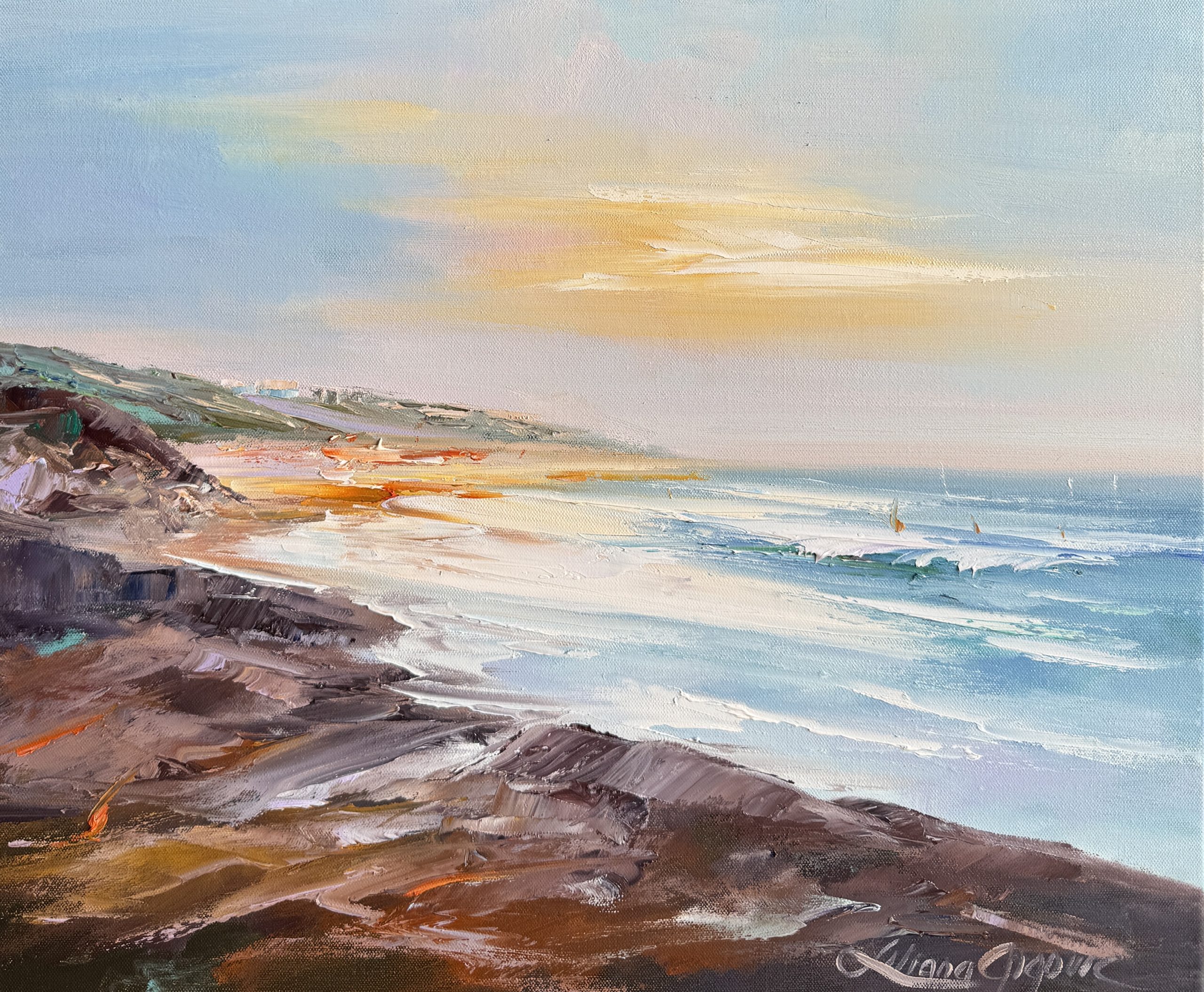 Soft pastel skies melt into warm golden light, while gentle blues and turquoise tones flow across the water, suggesting calm movement and coastal serenity. The palette-knife textures add depth and energy to the shoreline and rocky foreground, grounding the scene with earthy browns and subtle flashes of warmth.