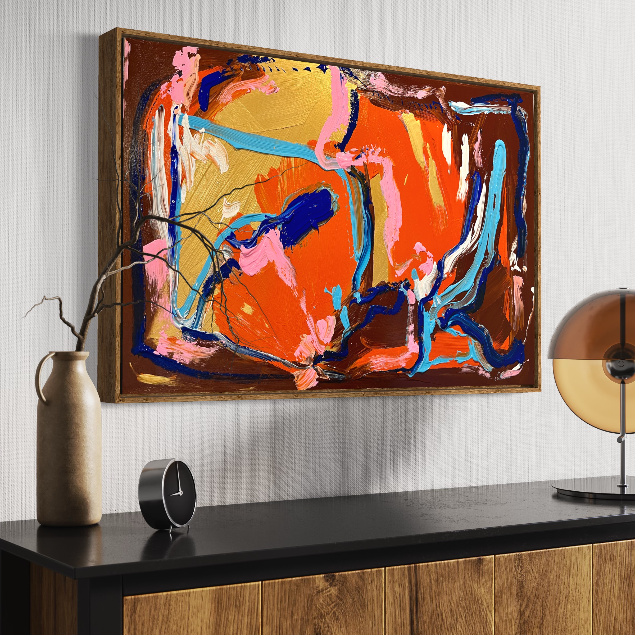– Unframed. The painting wraps around the sides so a frame is optional.