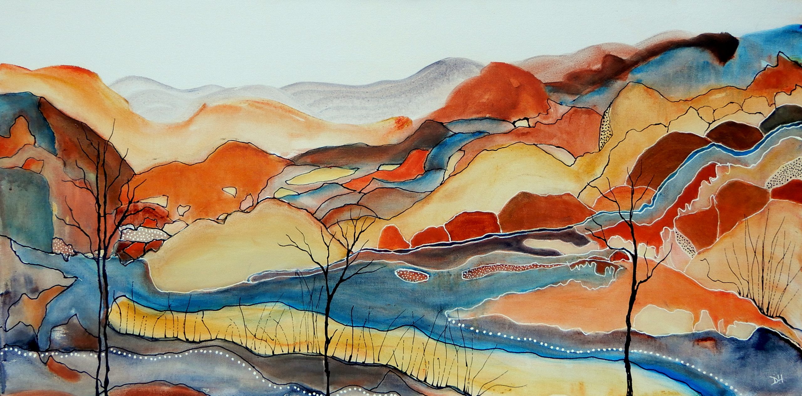 Trips to the beautiful desert landscapes of the Red Centre have inspired both abstract and more figurative works, depending largely on my mood for the day. In this painting I wanted to explore the shimmering colours and graceful undulations of the MacDonnell Ranges.