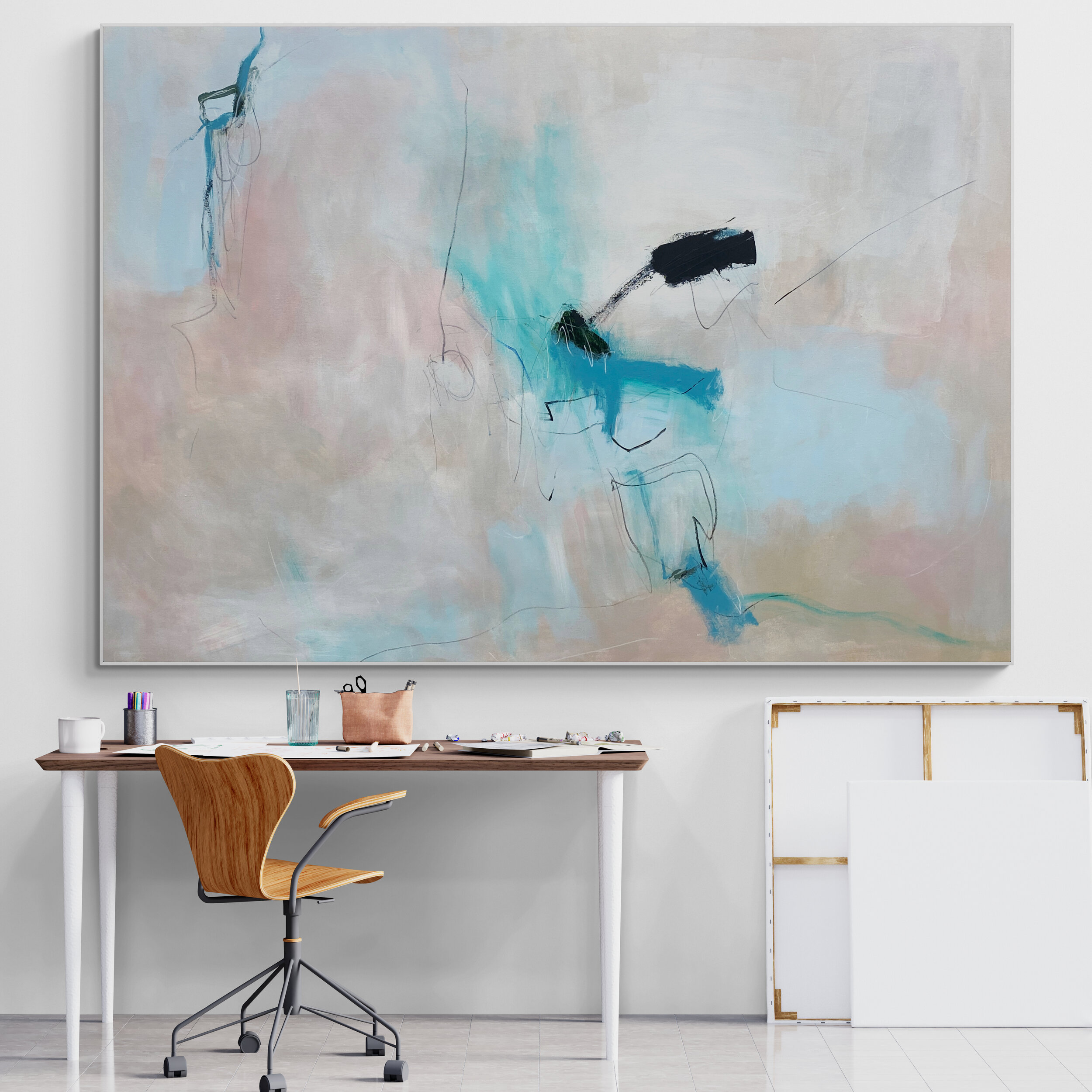The bold minimalist mark-making compliments this soft pastel palette of light blue, and various shades of green, pastel pink, blush, warm earthy tones of beige and white mixed with black, cool grey, and white thin line work.