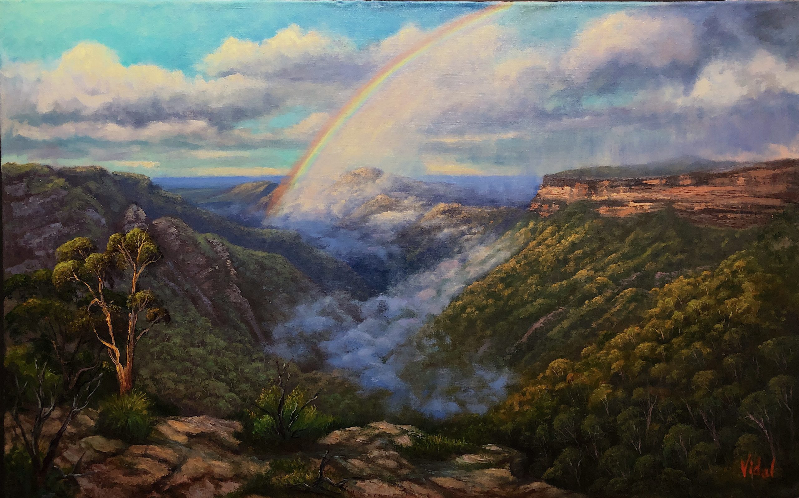 A painting inspired by my latest trip to Kanangra Boyd NP a few months ago. The natural beauty of the park and the play of light and colour must have provided me with a lot of inspiration for this painting. Painting weather conditions is interesting and challenging. In this painting, I tried to capture one of nature’s most beautiful phenomena, the rainbow. The rainbow is also a symbol of hope and a new beginning. The rainbow was painted using multiple glazes of paint in order to achieve its effect of luminosity and transparency.