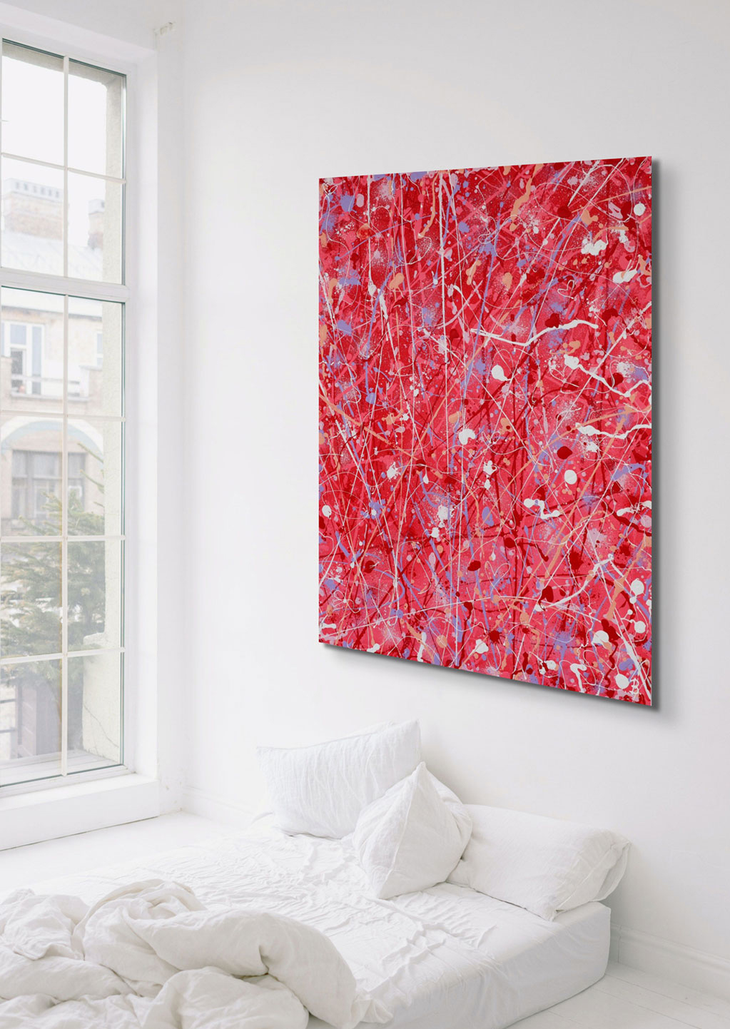 Passion, an original hand-painted abstract expressionism painting; one of the Artist’s favourites. It has been described as mesmerizing, exuding an undeniable energy of the Artist’s passion that pulsates through every stroke and hue. Layers of paint, applied with instinctive precision, create a textured canvas rich with depth and emotion.