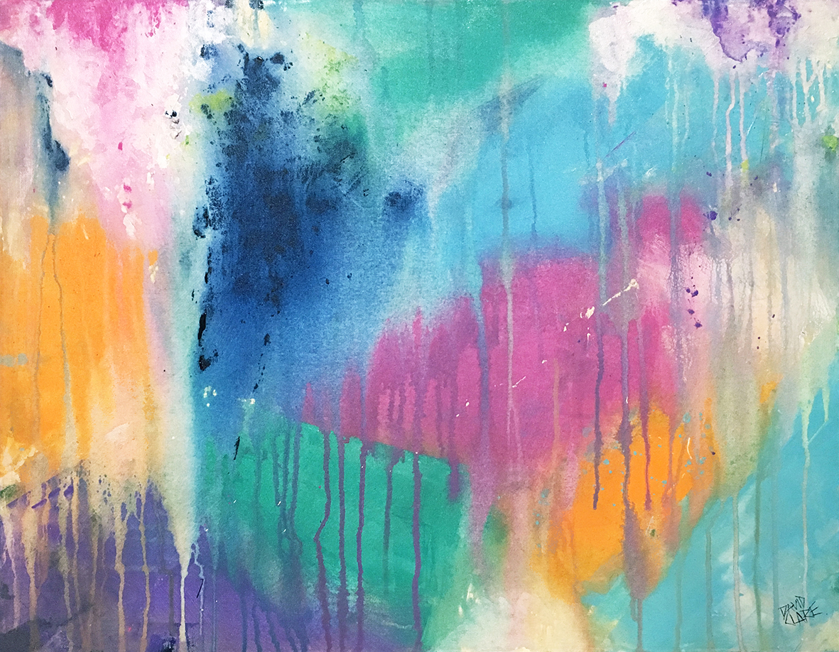 Abstract acrylic painting in dripping pastel colours, framed in pine shadow box frame.