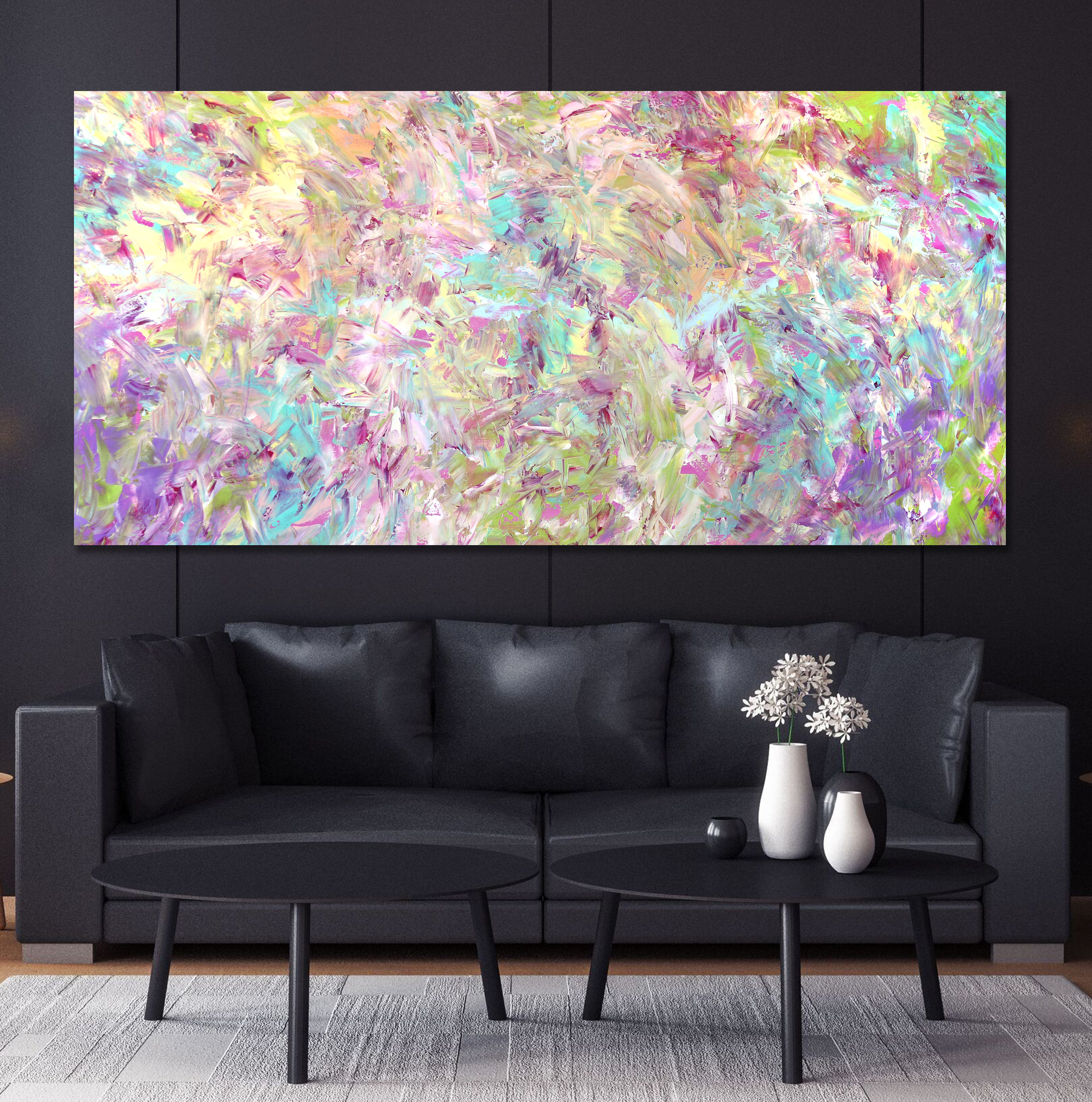 This work is painted on professional-grade canvas and has been sealed with varnish. The canvas has the dimensions is 195 cm in width by 95 cm in height. The sides are painted in the same manner as the surface so there is no need for a frame.