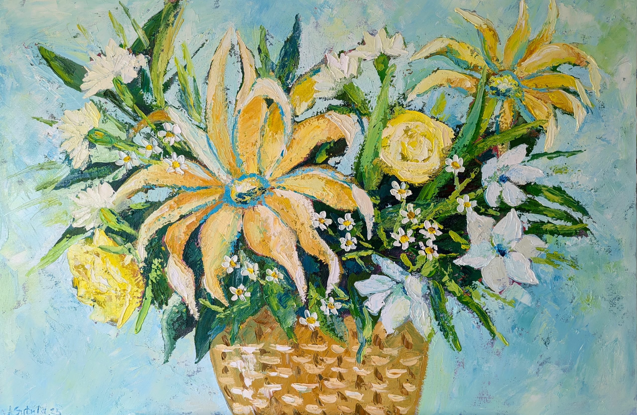 A celebration of new beginnings, “Pastel Spring Dreams” captures the soft radiance of spring in full bloom. Layers of acrylic form the foundation, while buttery oil paints—applied with a palette knife—bring rich texture and depth. Petals in golden hues, creamy whites, and tender greens dance together in a basket, evoking the warmth of sunlight and the delicate scent of a spring garden carried on the breeze.