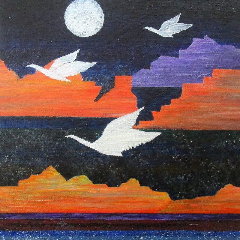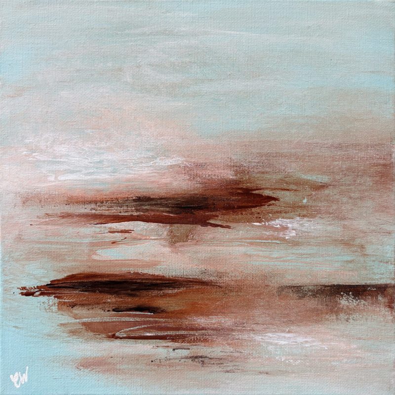 Path Through the Dunes  by Anne Strambi – Looking over the sunlit dunes at Pippi Beach, Yamba, where three children are playing on the far sandy shore. Gentle waves are rolling in towards the beach. Where the dunes are in shadow the colours are blue and purple, making the sunlit sand even more bright. This painting will be framed in a recycled timber frame. The frame measures 52 cm x 37 cm. (If you would prefer to choose your own frame, let me know and I can reduce the price for the painting unframed.)