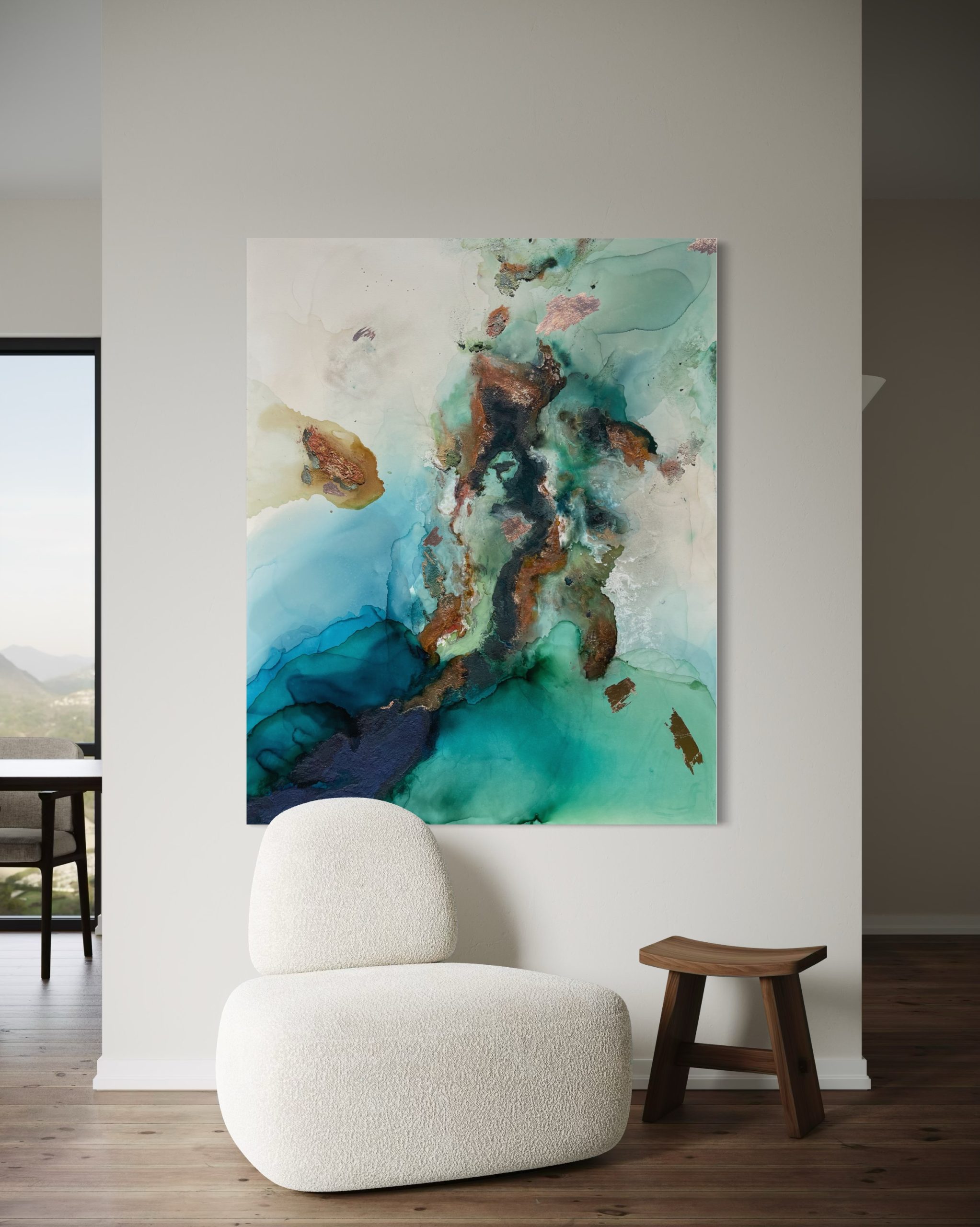 Inspired by the natural transformation of brass as it oxidises, Patina captures the powerful beauty of change over time. This large-scale mixed media piece blends vivid turquoise, deep teal, earthy rust, and soft metallic tones, echoing the rich, organic hues found in aged metals.