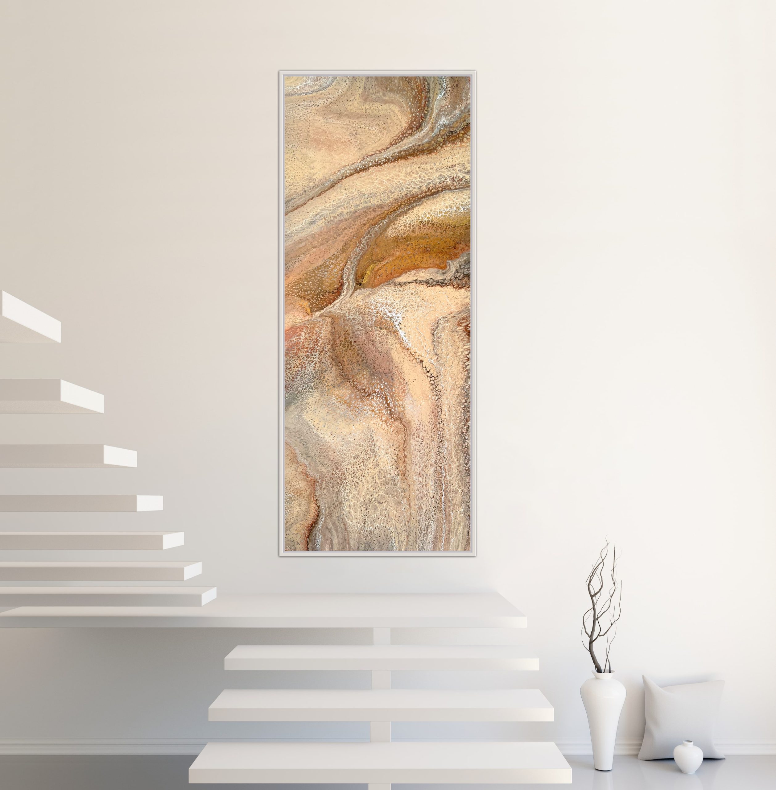 Patterned Sands was created using various techniques combined to allow increased flow, interaction and separation of colours to create interesting patterns where pops of colour can be seen emerging from underneath. This added dimension adds lace and cells to the artwork creating an interesting and one of a kind painting that can never be replicated. A gorgeous variety acrylic pigments were used including metallic yellow & rose gold, bronze, silver, cream, grey, black and white.