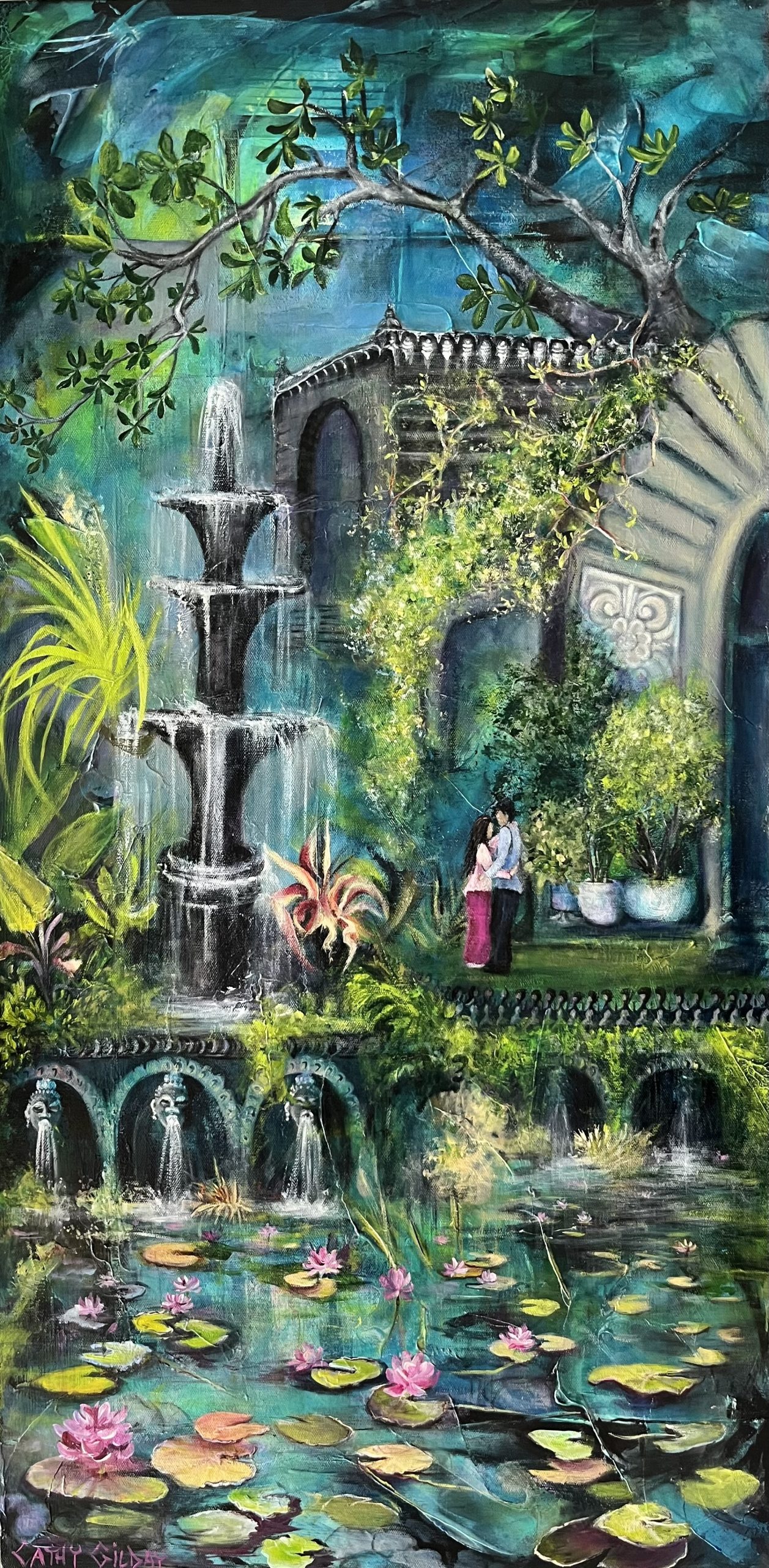 A romantic painting of a couple embracing in a tranquil Balinese styled garden, filled with lush green foliage, water fountains and a water lily pond. This composition was laid over a textured abstract background, which has created some beautiful textures and quiet shadowy areas. ,Sides painted, sealed.