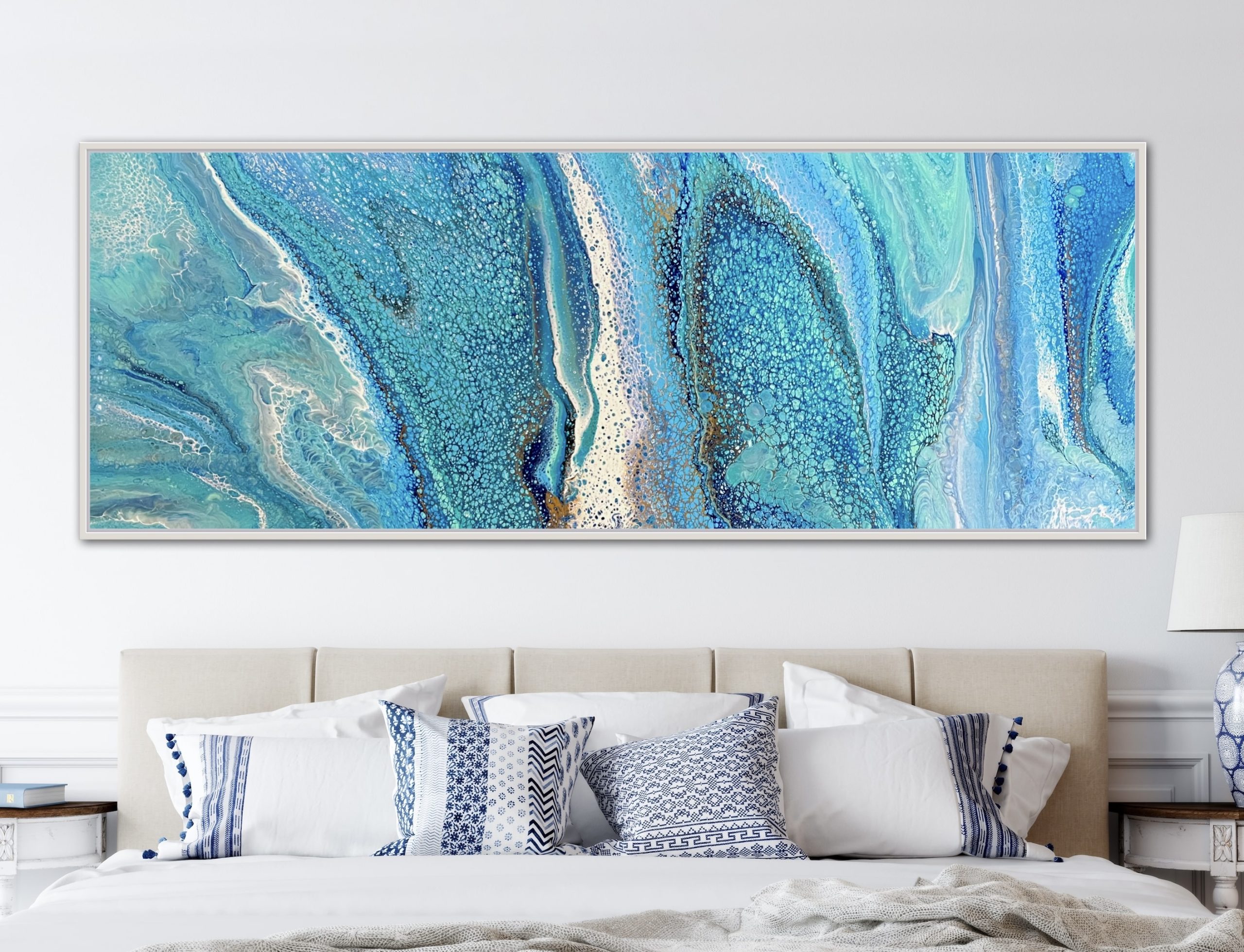 Peaceful Ocean was created using various techniques combined to allow increased flow, interaction and separation of colours to create interesting patterns where pops of colour can be seen emerging from underneath. This added dimension adds lace and cells to the artwork creating an interesting and one of a kind painting that can never be replicated.