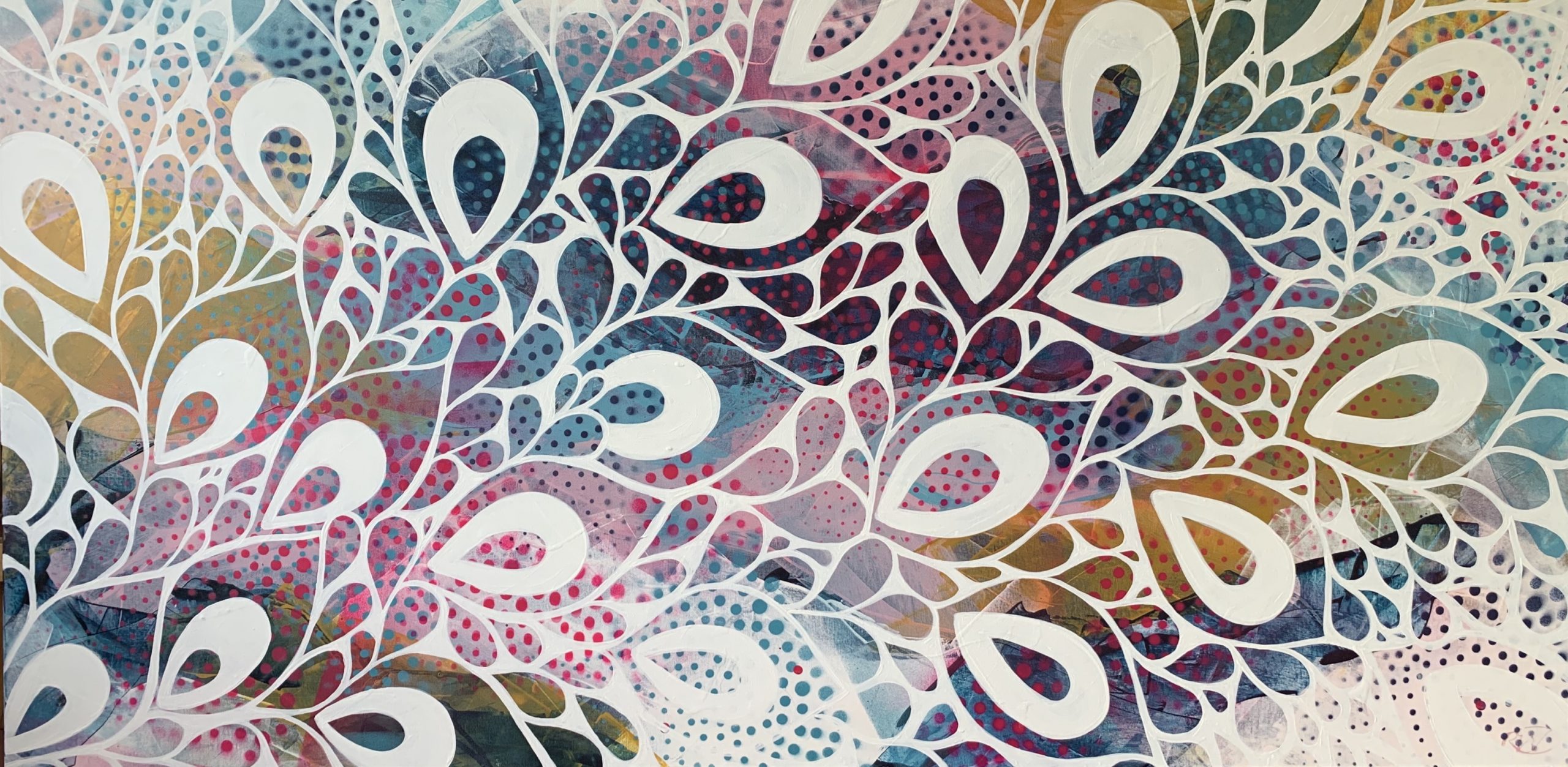 Peacock Fro Fro by Rebecca Warr – Similarly to some of my other work, this artwork is a reflection of my interest in pattern and positive and negative space. A background layer has been built up with the use of a catalyst wedge followed by stencil work with spray paint. Finally, a white pattern inspired by peacock feathers has been applied. The use of pastel pinks and blues has been juxtaposed with navy, yellow oxide and bright pink in the background to create a sense of slight contrast and harmony. The final application of white results in an aesthetically pleasing design catching the eye of the viewer and drawing them into the details.