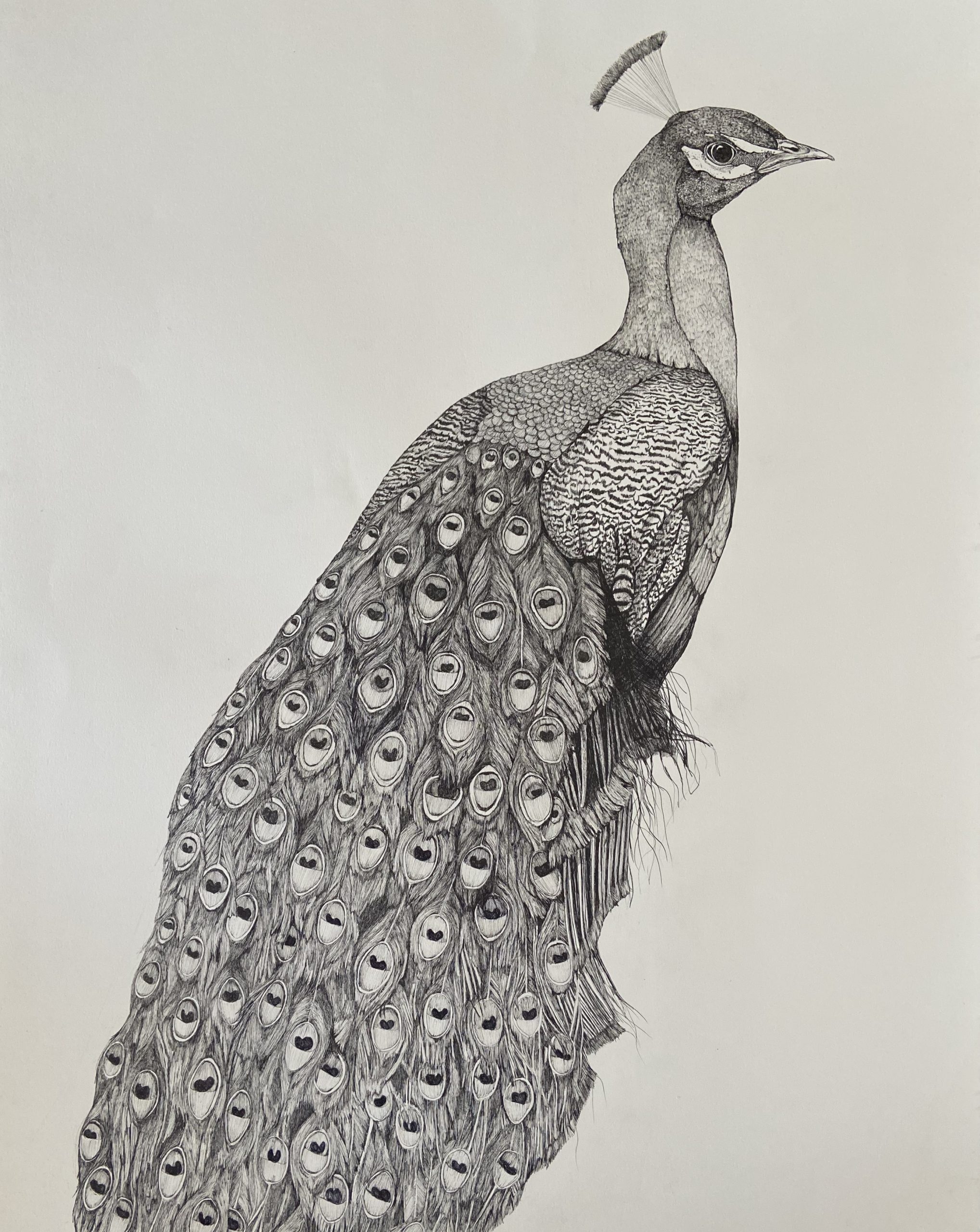 I have drawn this peacock in black and white to emphasise the details in the tail feathers.