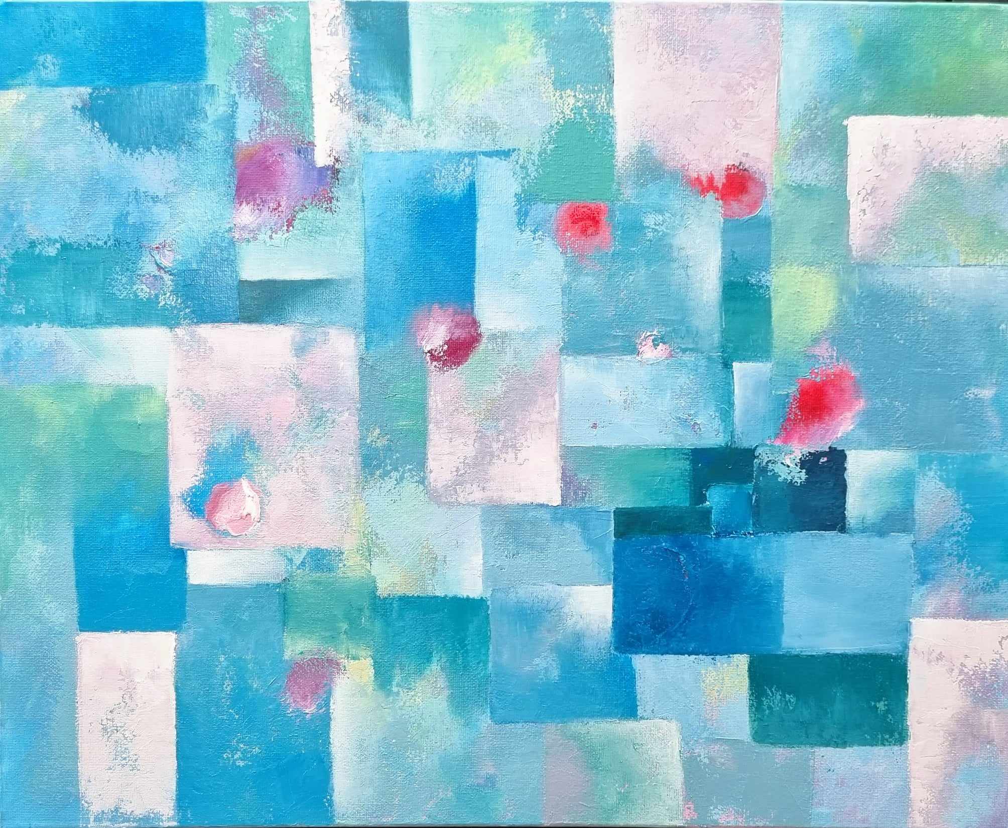 This painting is done in layers with palette knife and oil paint. This is an abstract composition in various shades of blue, green and pink. The edges are painted white. It’s vanished and ready to be displayed. It’s signed on the back