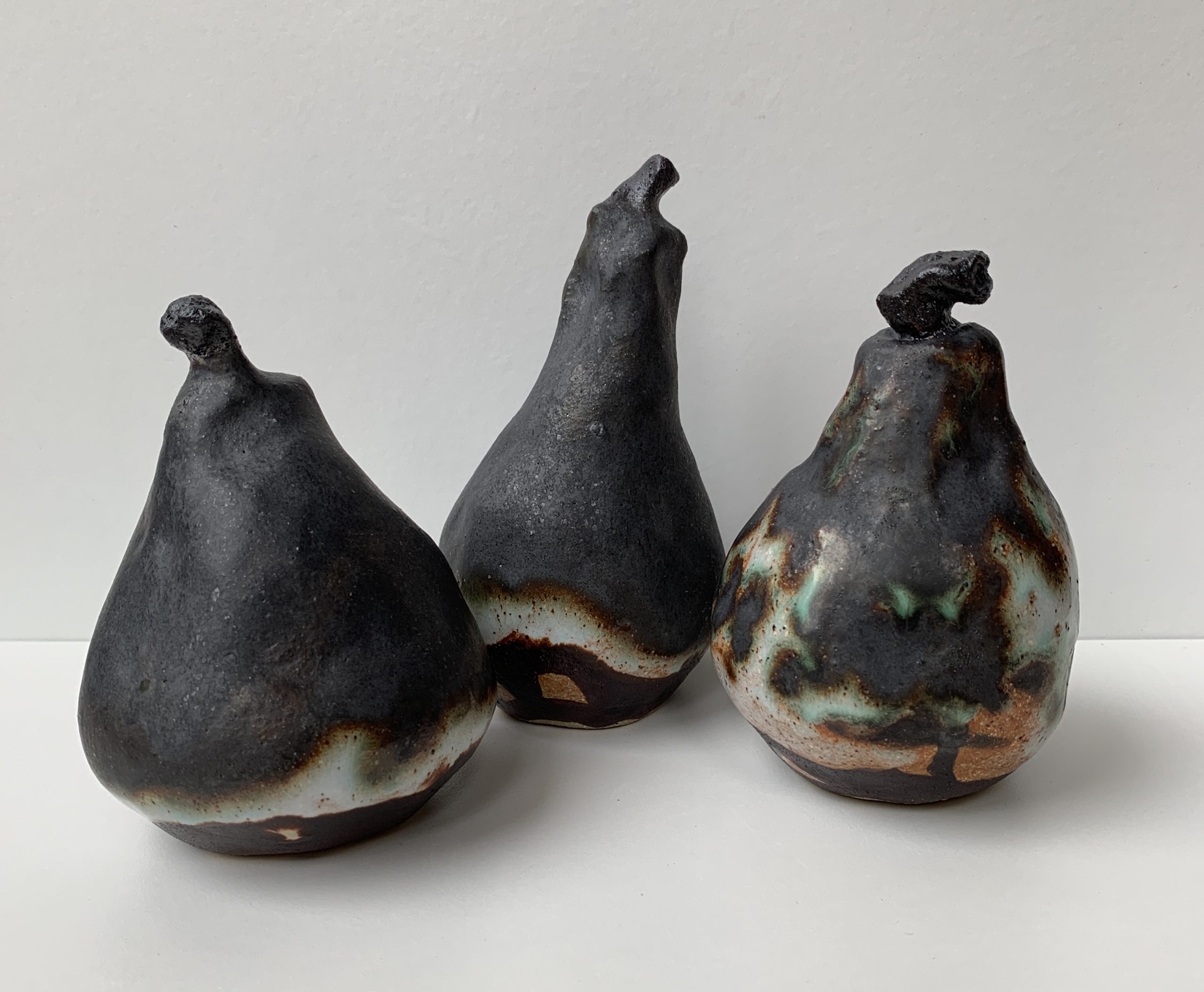 Pears sculpture series set of 3 by Kim Rees – glazed in combinations of copper, rust and a touch of white