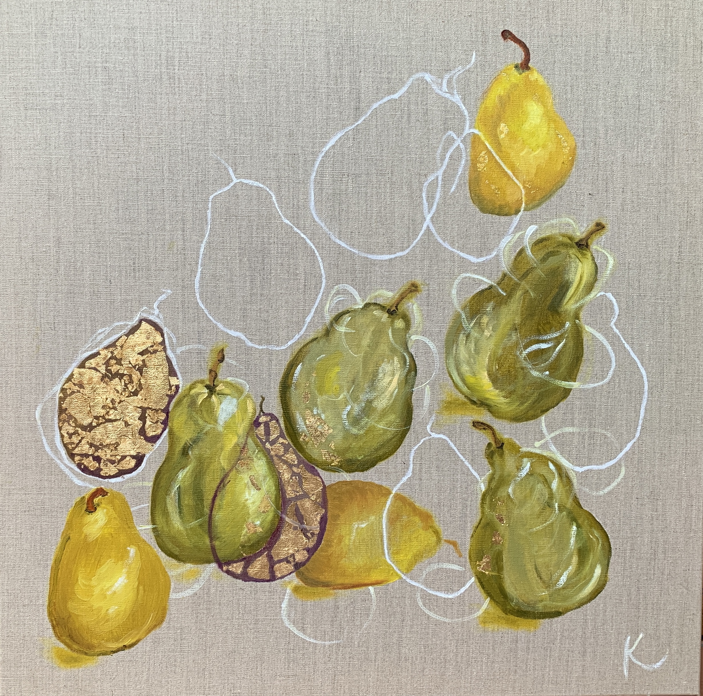 Peared on linen – by Kim Rees. Oil and gold leaf on premium linen – unframed.