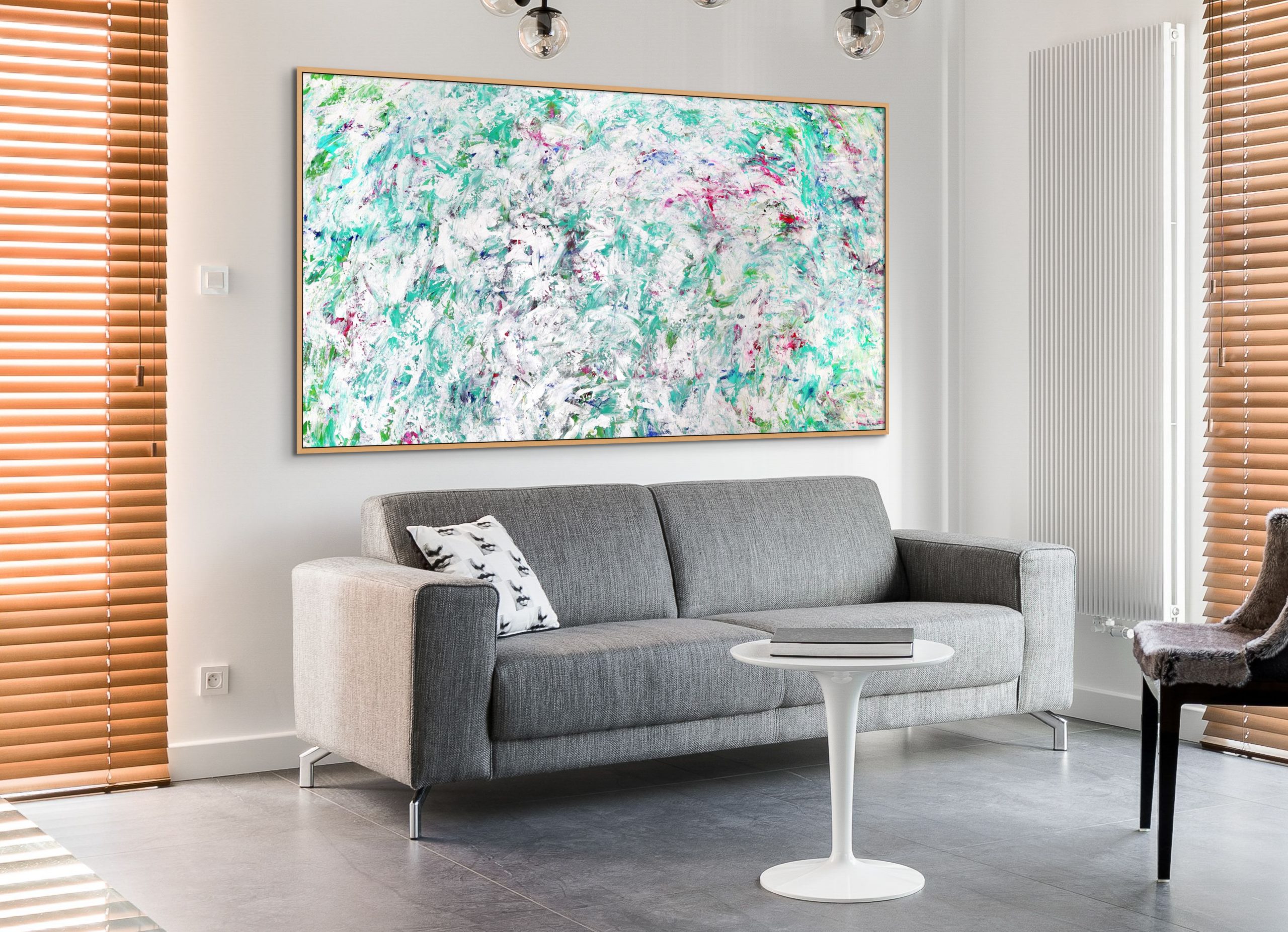 This artwork is painted on professional-grade canvas stretched and sealed with varnish. The canvas is 197 cm in width by 105 cm in height. The sides are painted in the same colours as the surface. The floating frame is not included but it is an optional extra.