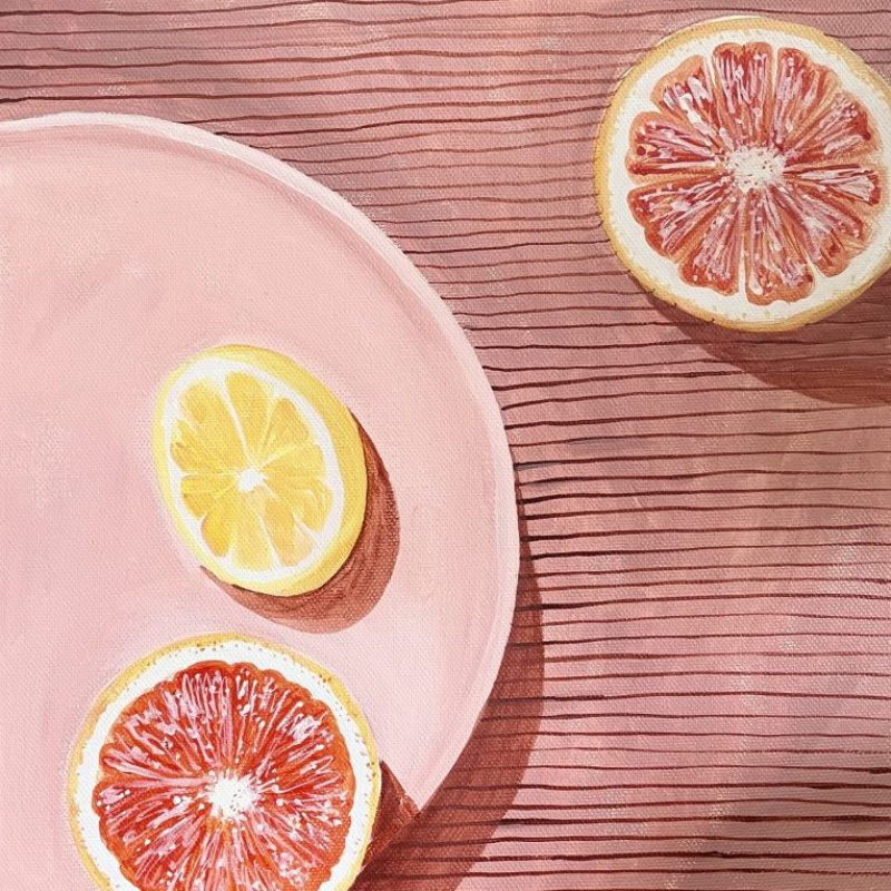 Pebble II by Ellen McKenna – Experimenting with only using a palette knife Pebble I and Pebble II feature thickly applied paint which creates beautiful textures across the canvas. Once again working with a monochromatic colour scheme I have started this work with a base colour (orange in this painting) and then tinted it with white or shaded it with black to produce a range of colours – each one an extension of the original Orange base colour. I also wanted to play with adding white paint for the background. Generally I just leave the white sections of the canvas bare, but with Pebble II have filled in the gaps with white paint to create extra depth and texture to the artwork.