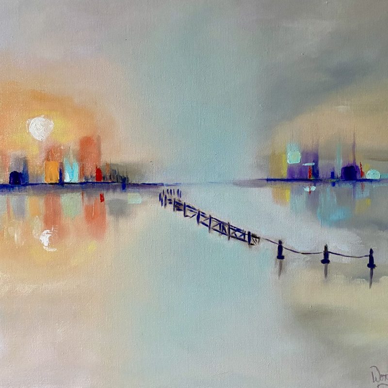 This bright painting is done in many layers to achieve extra depth. The edges are painted in neutral grey.