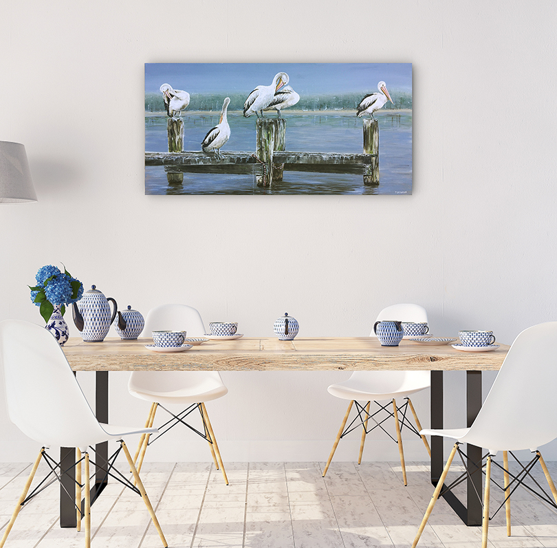 This painting depicts a flock of Australian pelicans passing the time on an old unused wooden jetty. This jetty has been a very popular meeting spot for these fanciful birds who have claimed it their own. A tranquil river scene, is it the Murray, the Goulburn or the Yarra? It could be another river, you decide. Suited to any room or office, this tranquil scene will be no doubt a favourable talking point.