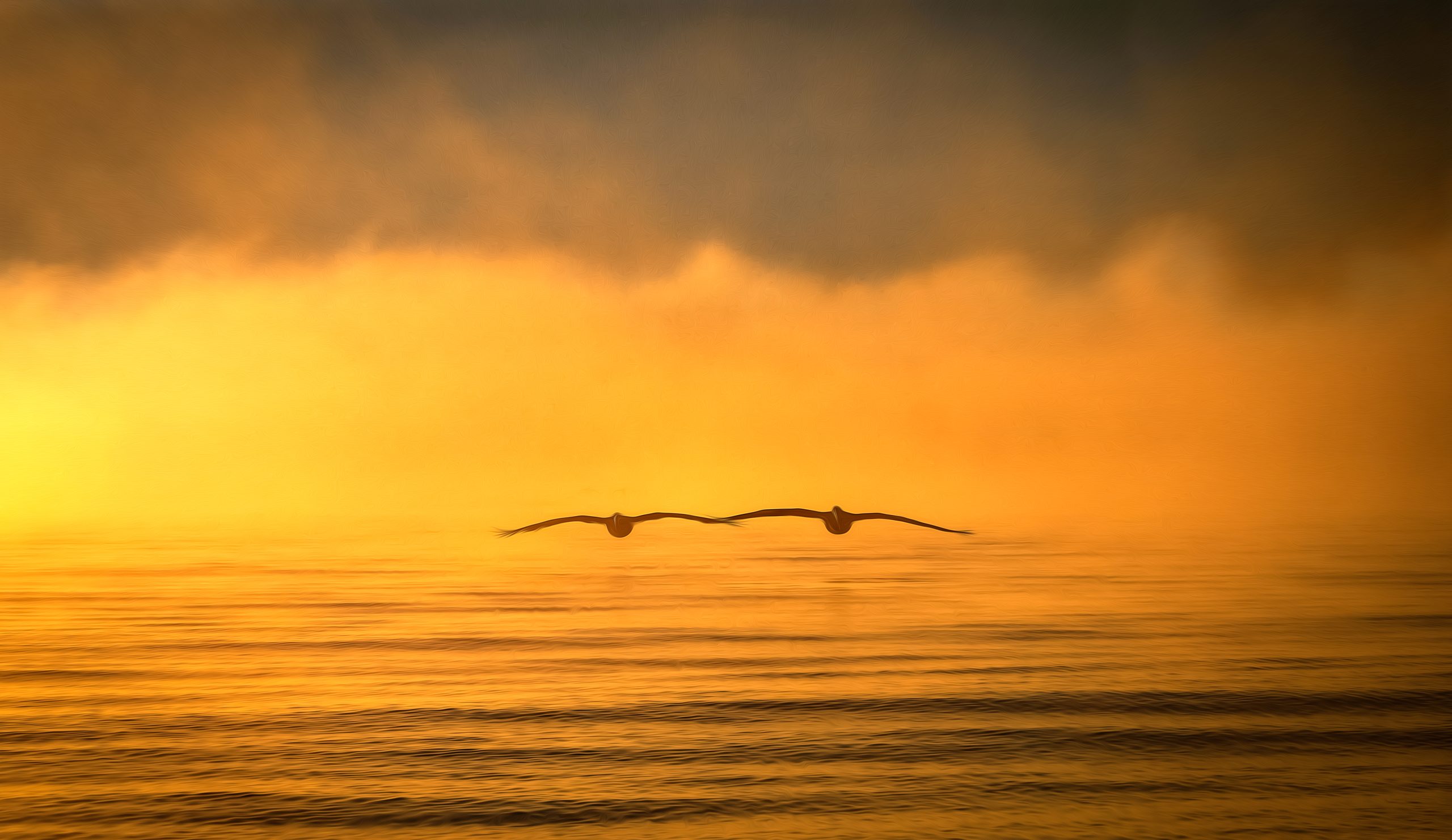 Pelicans flying low through the mist at sunrise over the waters of Lakes Entrance.