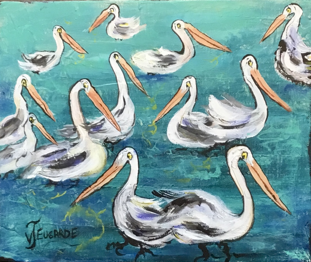 Pelican Gathering by Valerie Eugarde:- This is based on a photo I took at Amity Point on North Stradbroke island, the pelicans were a daily sight and I loved their comical expressions and hope to capture their silly faces, we loved to see their bulky clumsy bodies land on the water. Always fed them our fish as in those days there was a plentiful supply of fish.