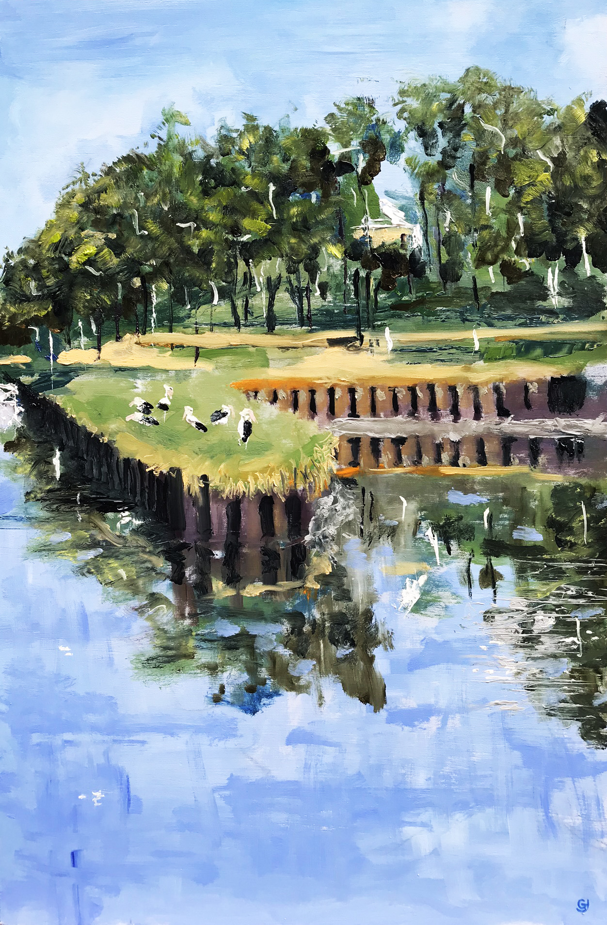 Pelicans, Cooks River by Geoff Hargraves – Oil painting , a view looking towards Hurstone park across the Cooks River in south west Sydney. Several Pelicans rest on the peninsular protecting the boat harbour cut into the riverbank for the sea scouts. Sides painted black, wire across back.