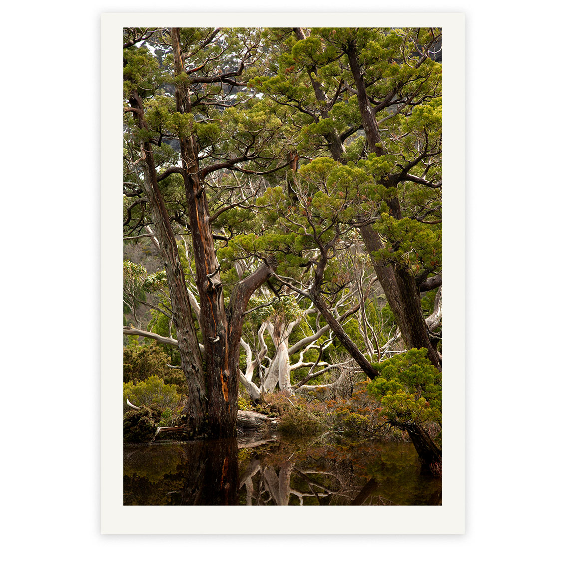 Pencil Pines lean over the waters of the Artists’ Pool framing a twisted snow gum in Tasmania’s Cradle Mountain wilderness region.